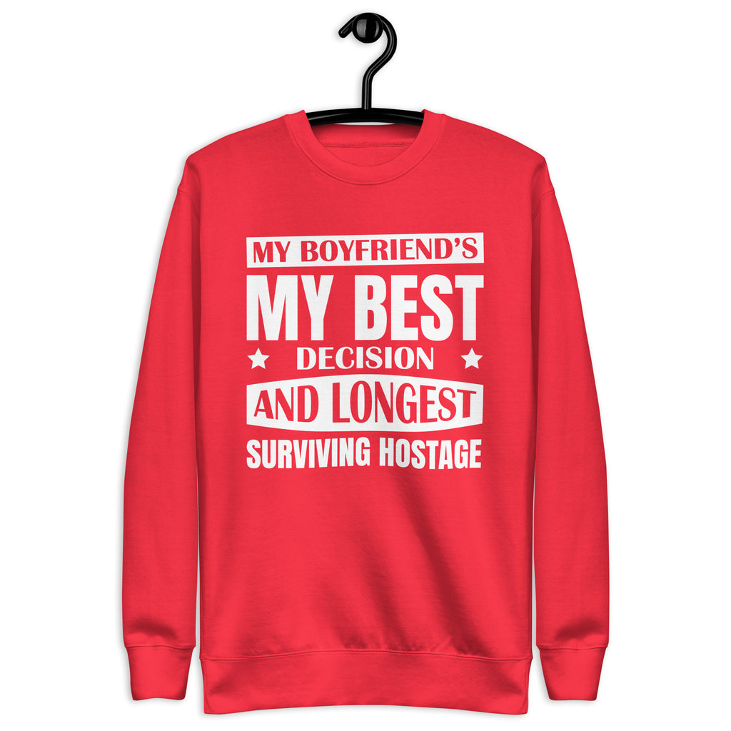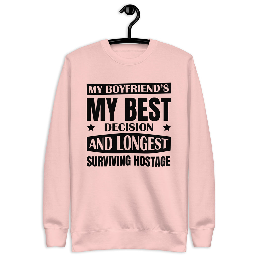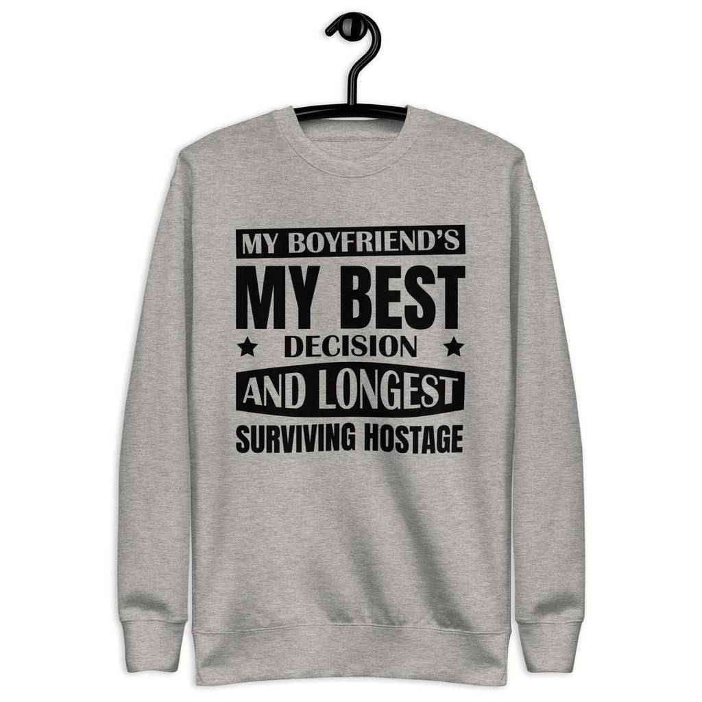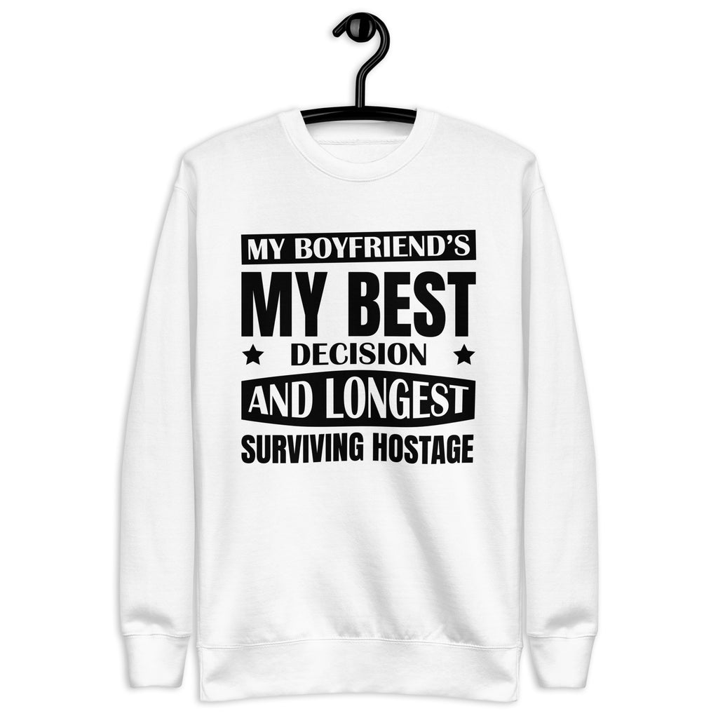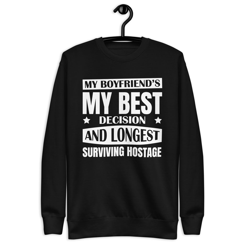 This “My Boyfriend’s My Best Decision and Longest Surviving Hostage” sweatshirt is for the girlfriends who love hard, joke harder, and know their relationship thrives on equal parts affection and chaos. It’s sweet, sassy, and just the right amount of unhinged — because love isn’t perfect, but it’s definitely entertaining.