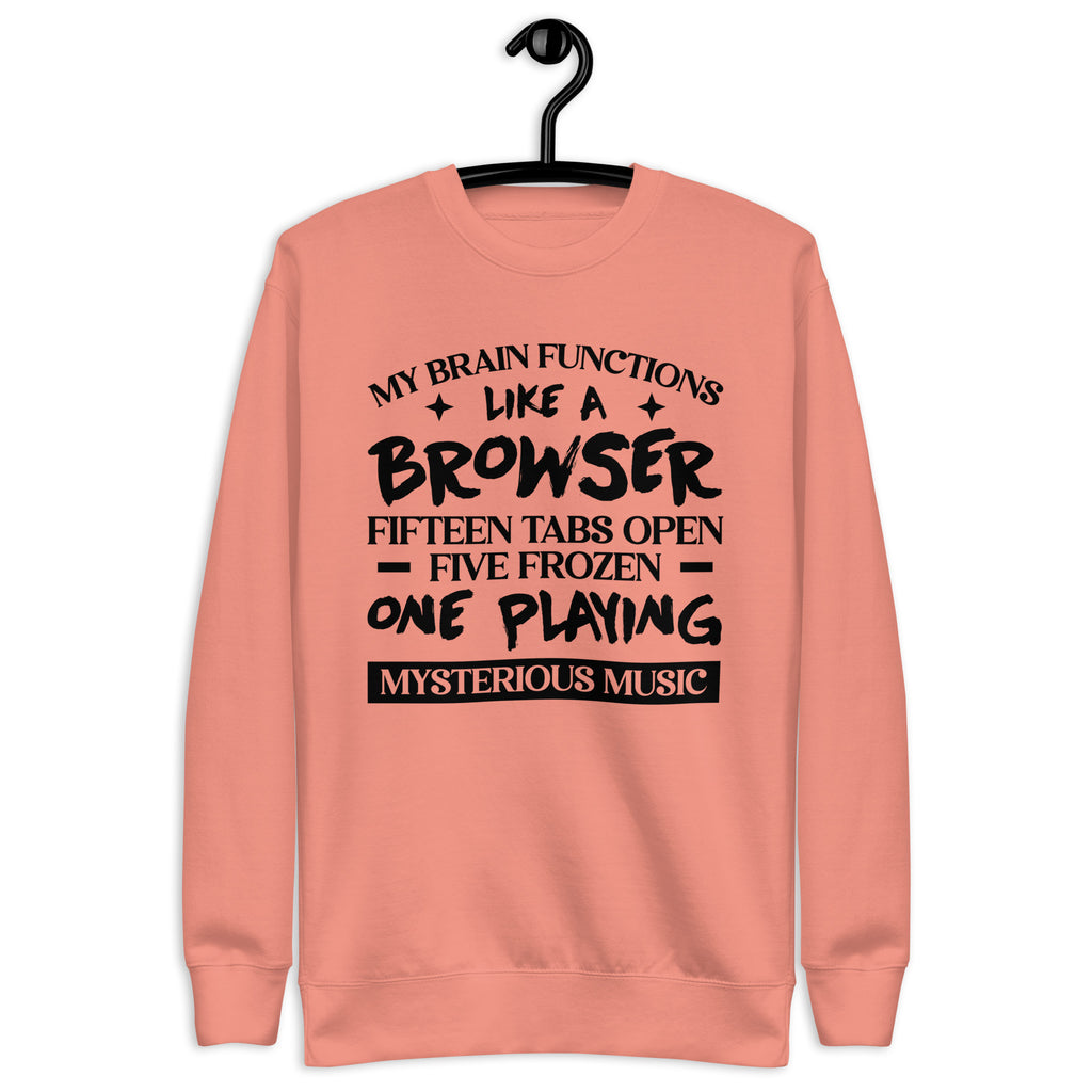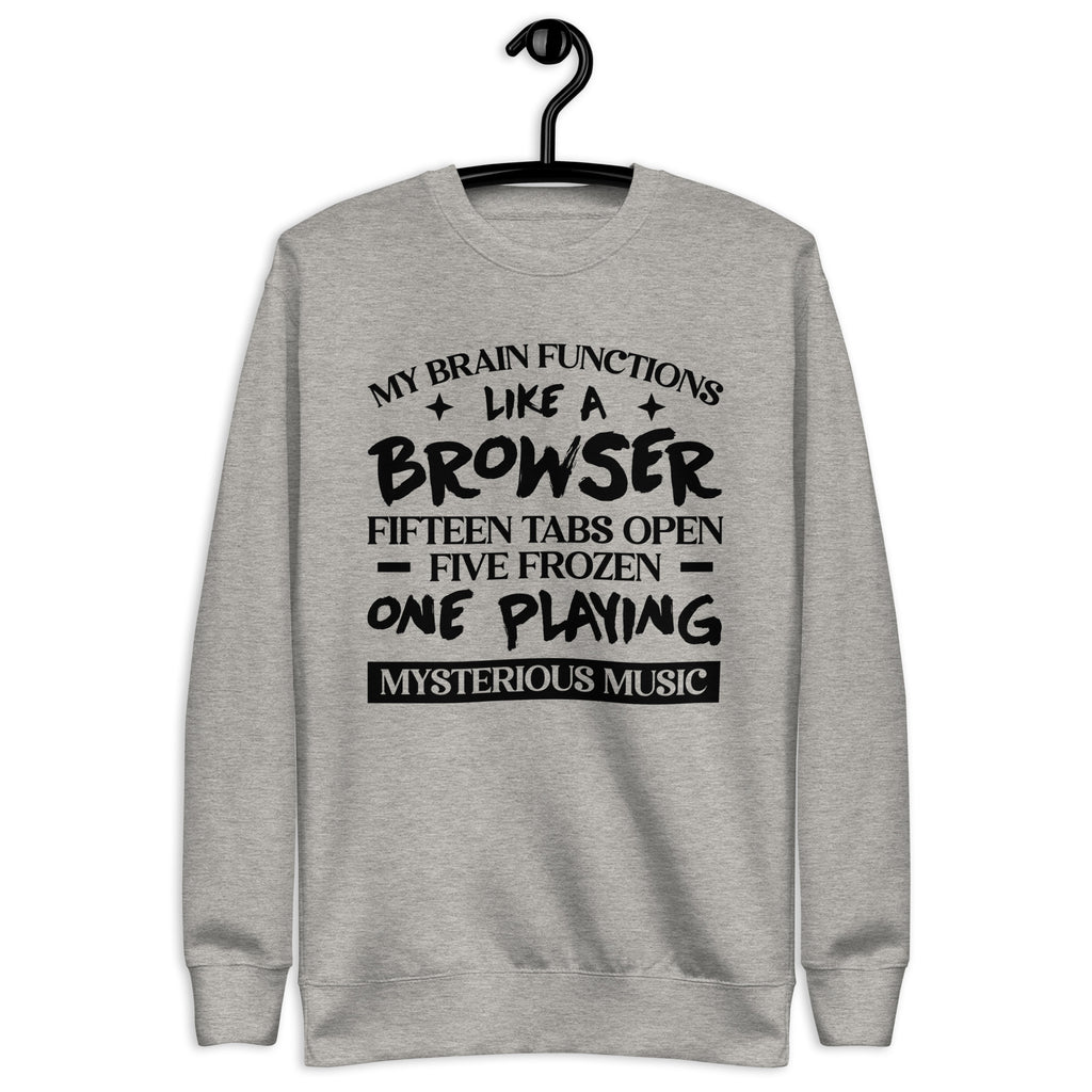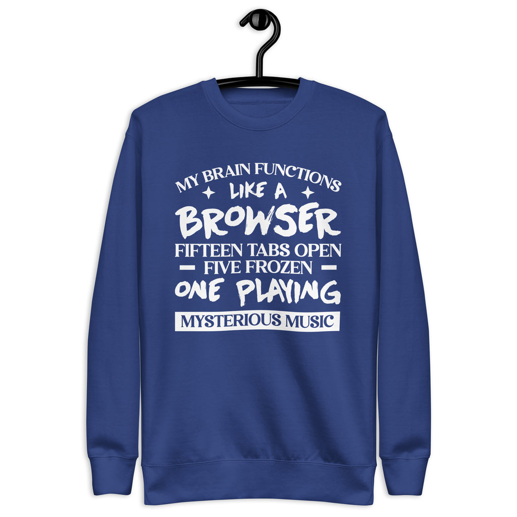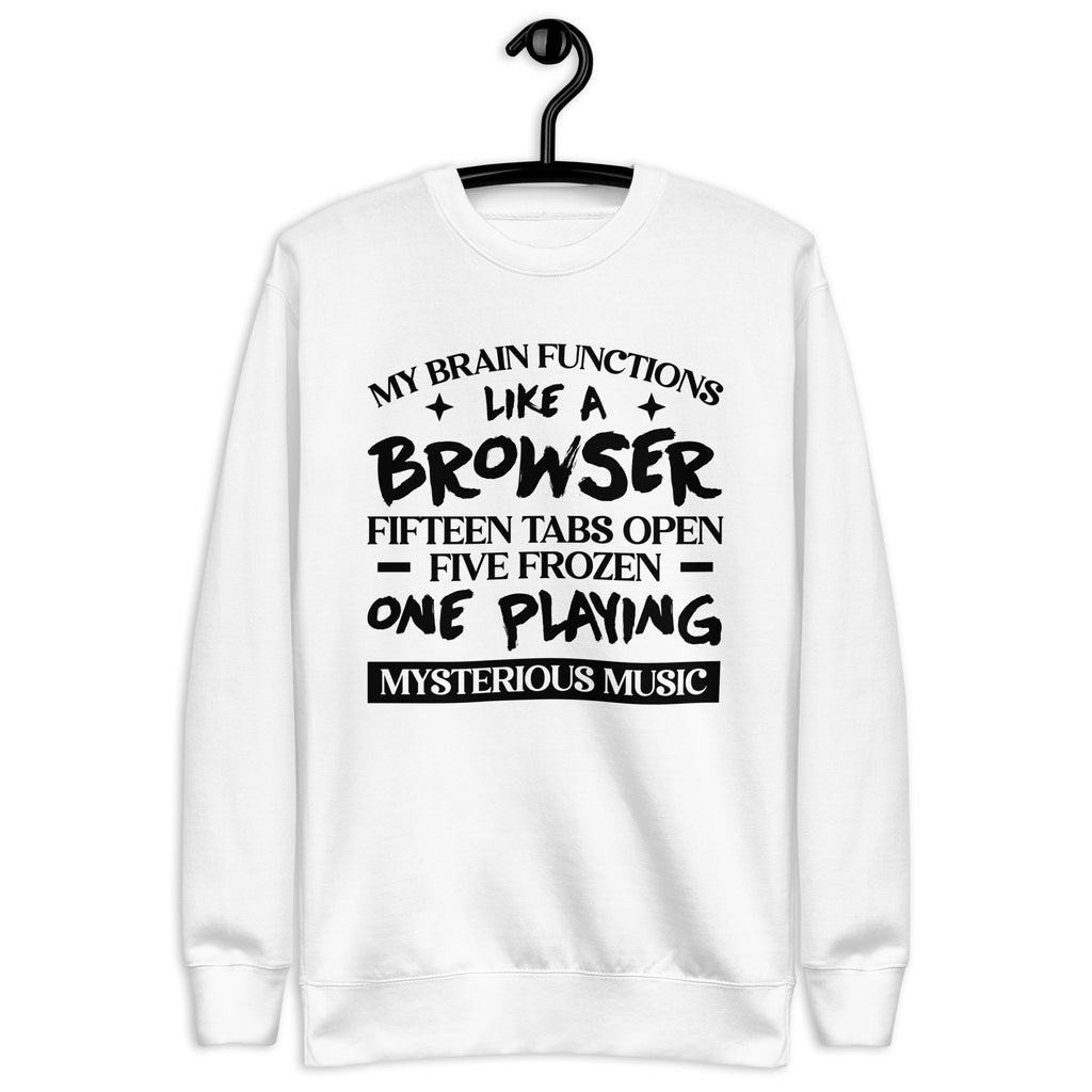 Scattered, brilliant, and a little chaotic — this “My Brain Functions Like a Browser: Fifteen Tabs Open, Five Frozen, One Playing Mysterious Music” sweatshirt is made for anyone whose mind refuses to operate in a straight line. You’re not distracted — you’re just running multiple mental apps with questionable Wi-Fi.