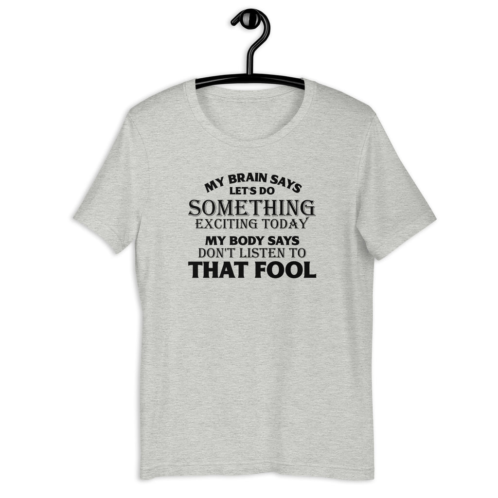 When your brain is full of adventurous ideas but your body just wants a nap—this shirt sums it up perfectly. Featuring the playful phrase “My Brain Says Let’s Do Something Exciting Today,” this tee is the ultimate mood for anyone who loves the thought of excitement but also loves their couch just as much.