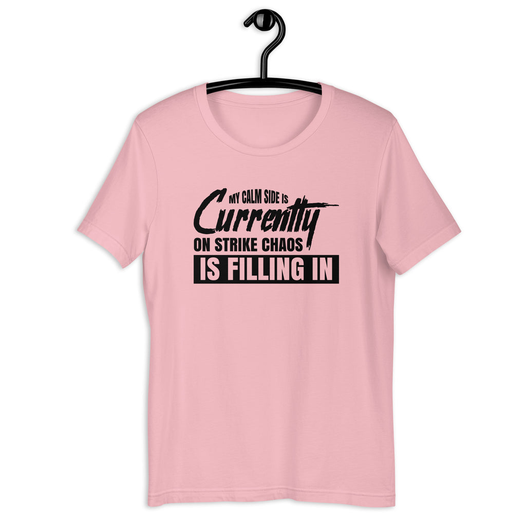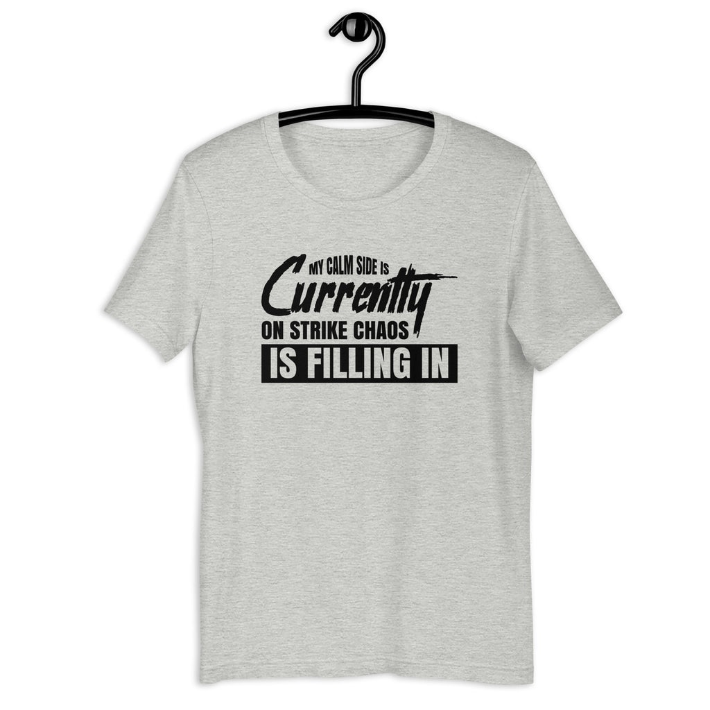 Embrace your beautifully unbalanced energy with the “My Calm Side Is Currently on Strike — Chaos Is Filling In” T-shirt. Perfect for anyone whose peaceful vibes occasionally take an unapproved vacation, this tee captures the hilarious truth of letting your inner chaos clock in for an unexpected shift.