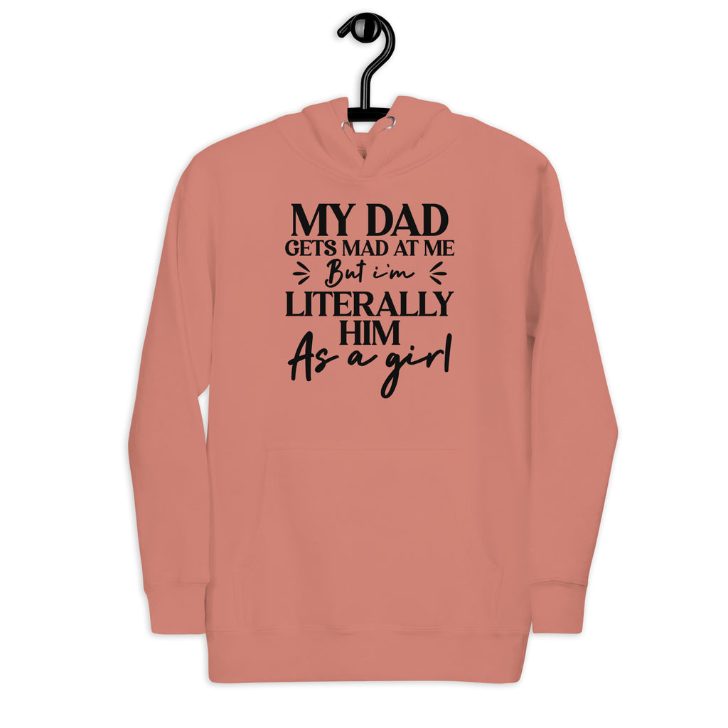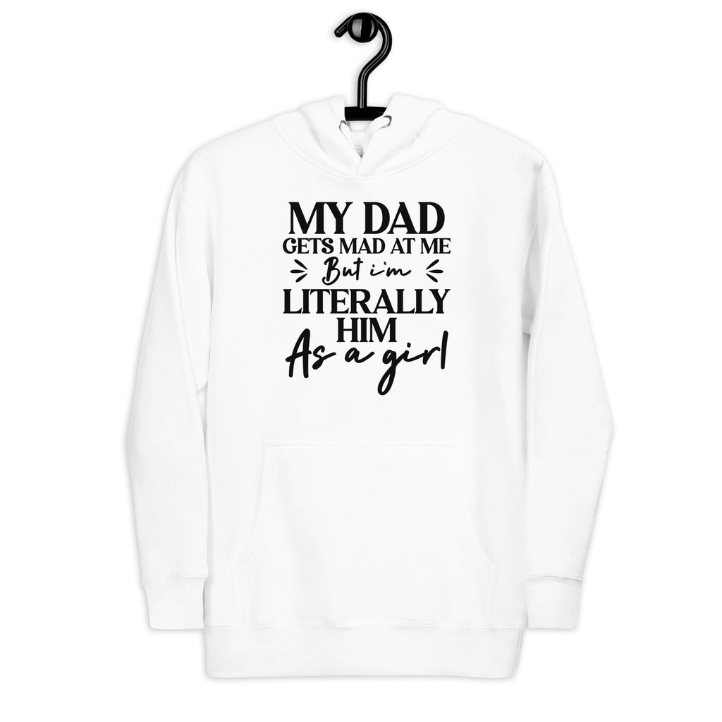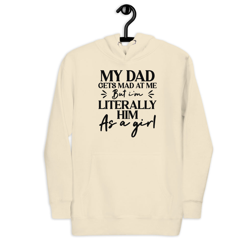 Celebrate family resemblance with a twist in the “My Dad Gets Mad at Me But I’m Literally Him as a Girl” hoodie. Perfect for daughters who know they’ve inherited more than just looks, this hoodie hilariously captures the clash (and bond) that comes with being just like dad.