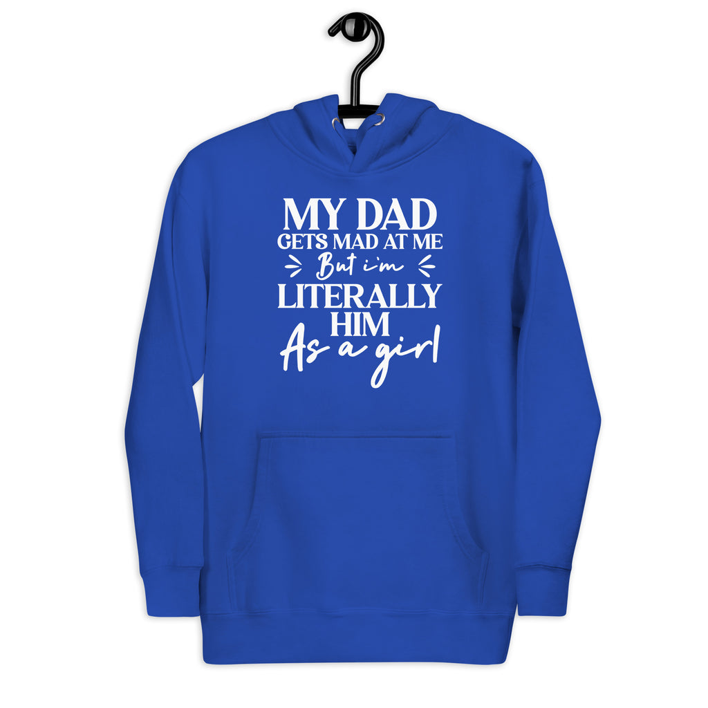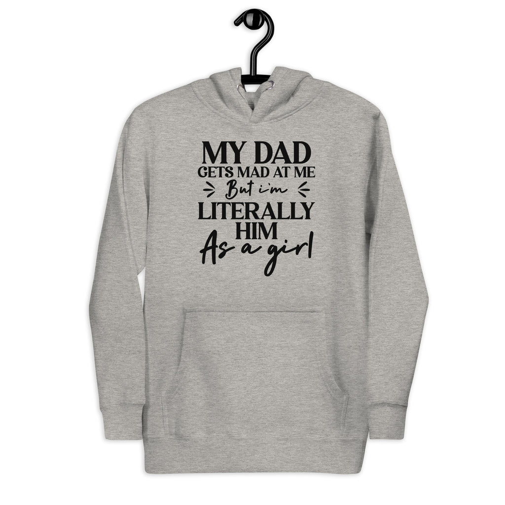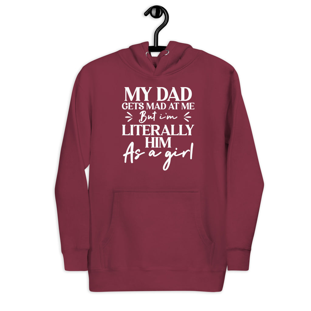 Celebrate family resemblance with a twist in the “My Dad Gets Mad at Me But I’m Literally Him as a Girl” hoodie. Perfect for daughters who know they’ve inherited more than just looks, this hoodie hilariously captures the clash (and bond) that comes with being just like dad.