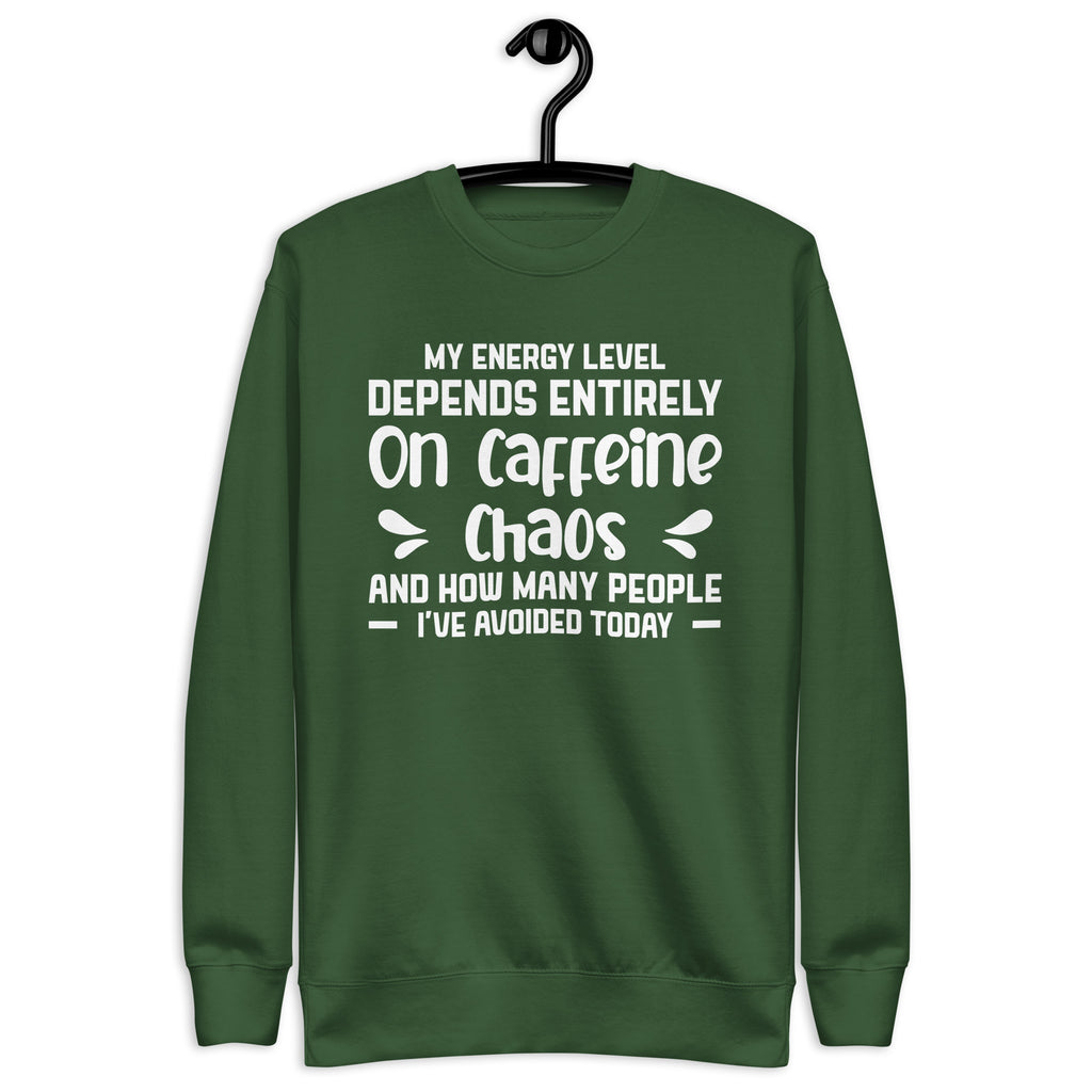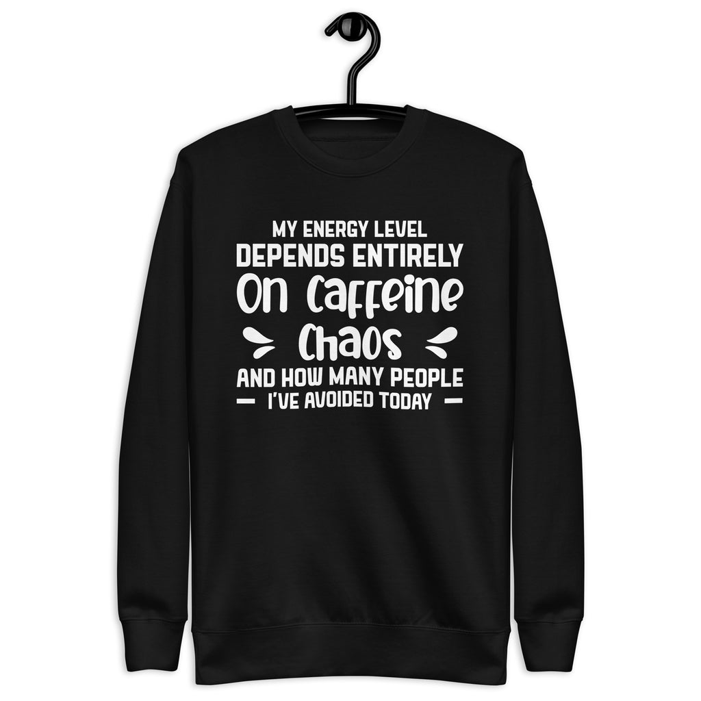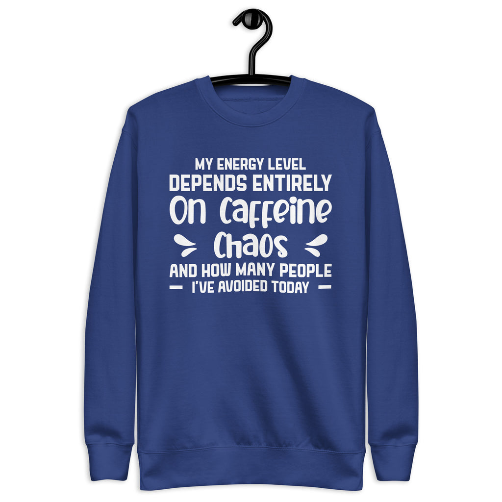 Self-aware, selectively social, and powered by pure caffeine — this “My Energy Level Depends Entirely on Caffeine, Chaos, and How Many People I’ve Avoided Today” sweatshirt captures the exact formula that keeps you functioning. You’re not drained — you’re just conserving energy like a professional.