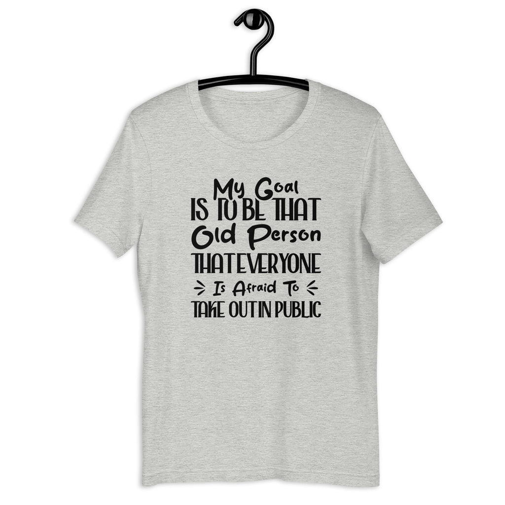 Keep your sense of humor alive and your mischief thriving with this “My Goal Is to Be That Old Person That Everyone Is Afraid to Take Out in Public” t-shirt. Perfect for anyone who plans to age disgracefully, this funny tee celebrates the joy of speaking your mind, causing a little chaos, and having zero regrets.