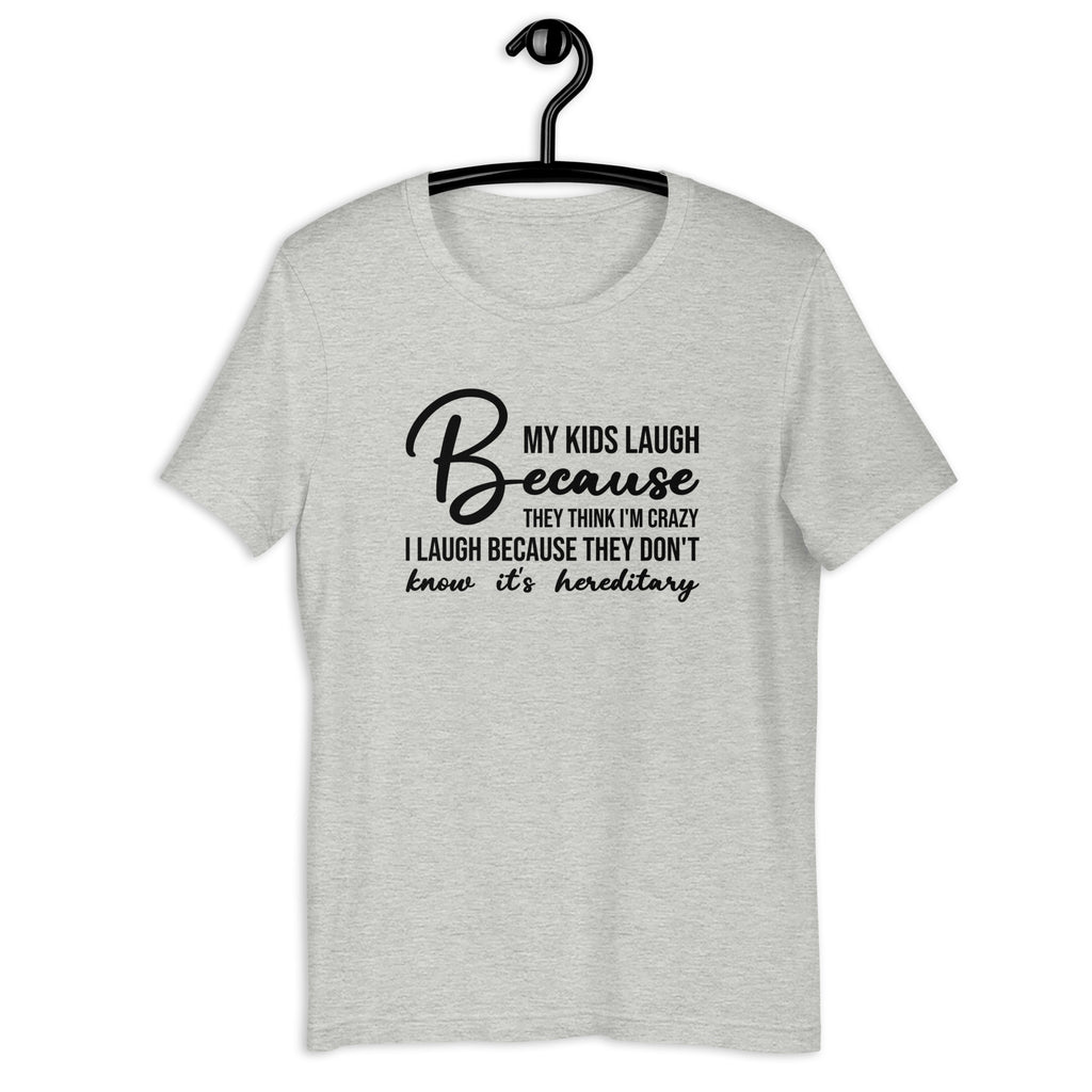 Let everyone know your family’s chaos didn’t start with your kids — they just inherited it — with the “My Kids Laugh Because They Think I’m Crazy, I Laugh Because They Don’t Know It’s Hereditary” T-shirt. This tee delivers the perfect blend of humor, honesty, and playful parent energy, making it a must-have for anyone who deals with life’s madness using sarcasm and a smile.