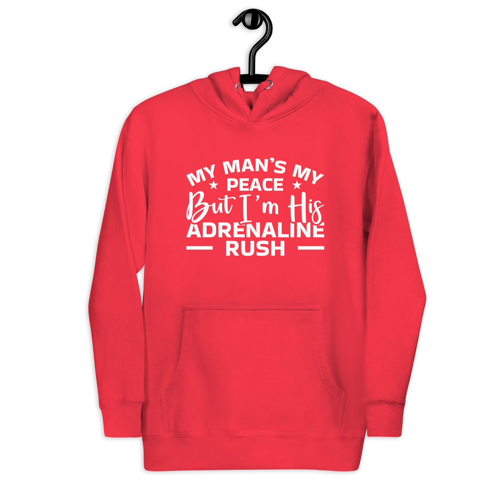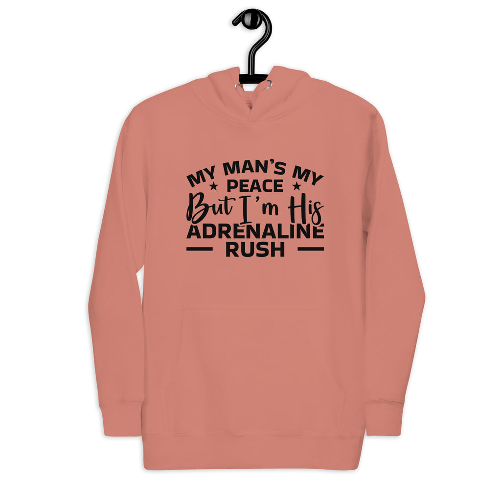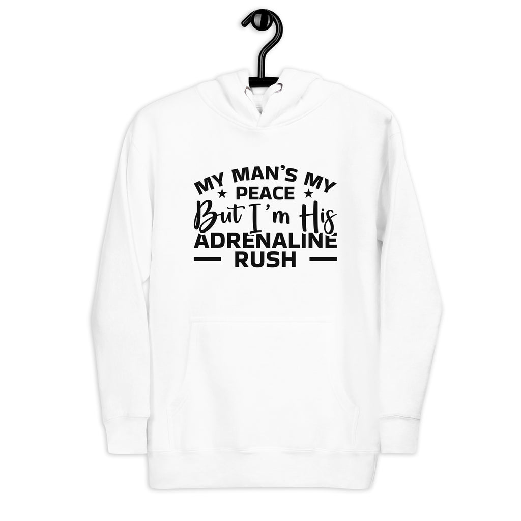 This “My Man’s My Peace, But I’m His Adrenaline Rush” hoodie is the perfect mix of calm and chaos — just like your relationship. It’s for the woman who brings love, balance, and maybe a little bit of trouble wherever she goes. Sweet, bold, and playfully honest, this hoodie celebrates being the peace and the storm all in one.