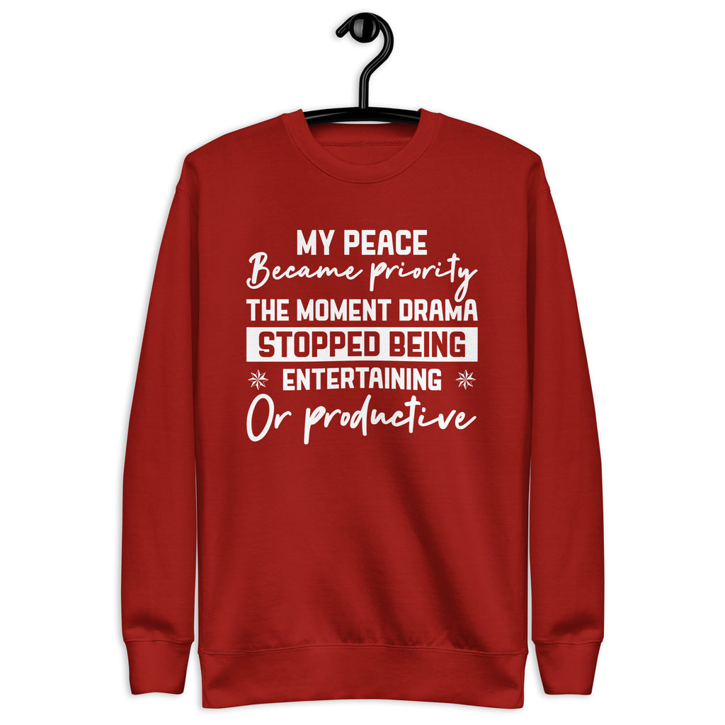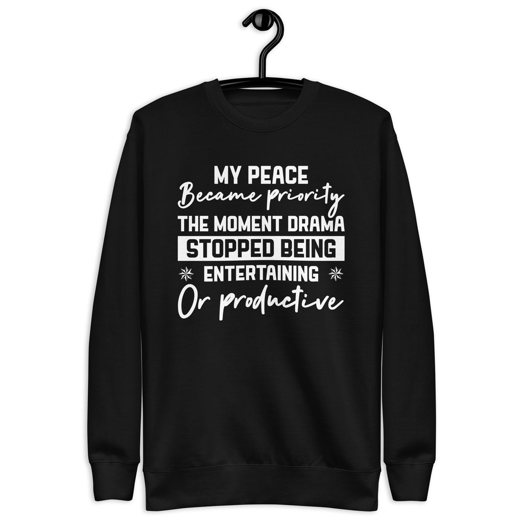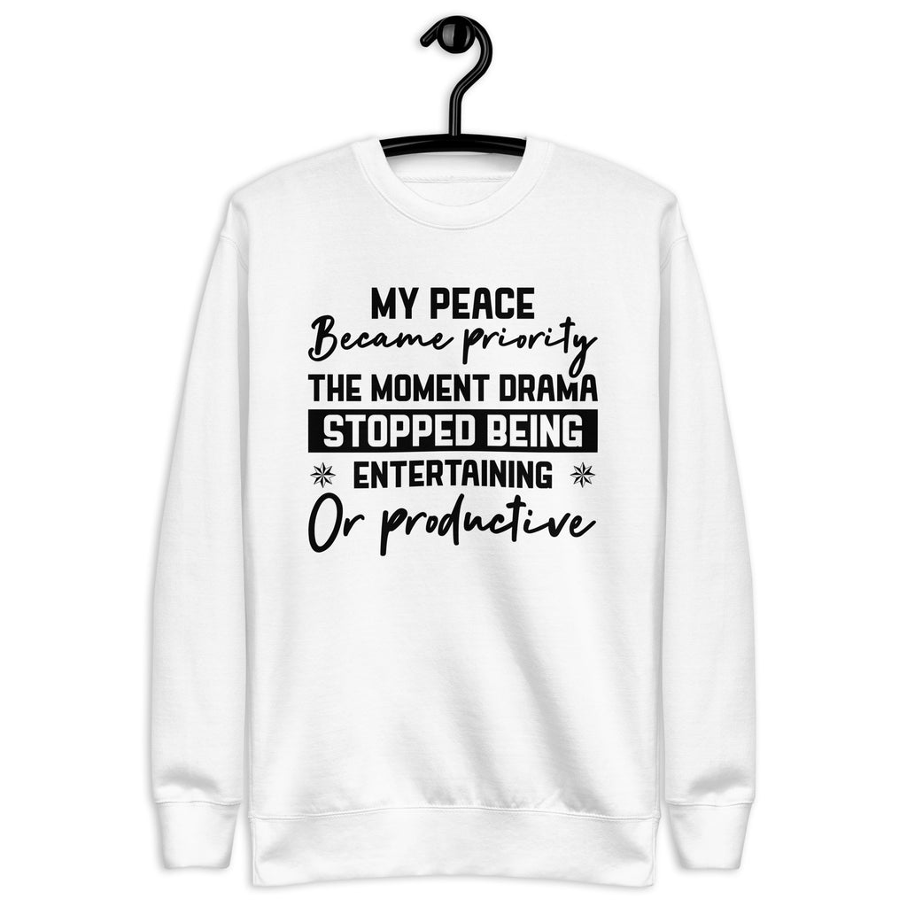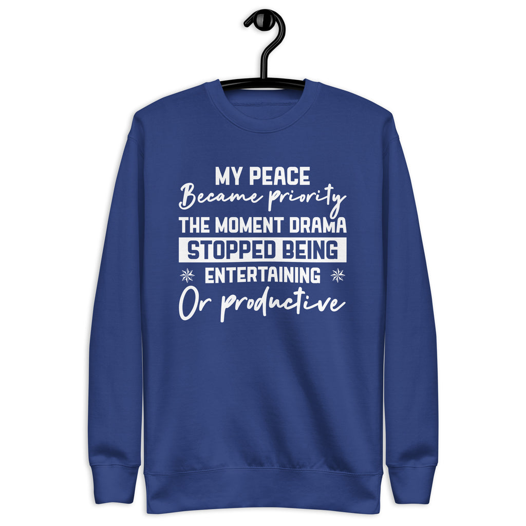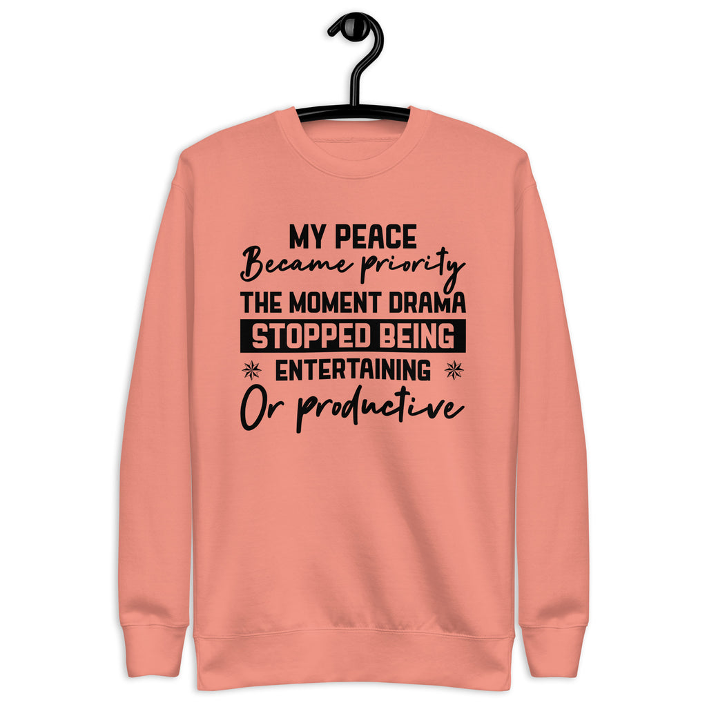 Calm, intentional, and unapologetically discerning — this “My Peace Became Priority the Moment Drama Stopped Being Entertaining or Productive” sweatshirt is for anyone who knows the value of protecting their energy. You don’t chase chaos; you rise above it. Peace isn’t optional — it’s a choice you make daily.