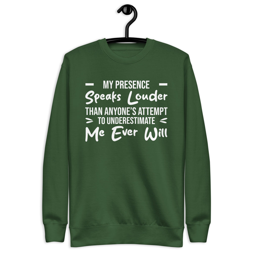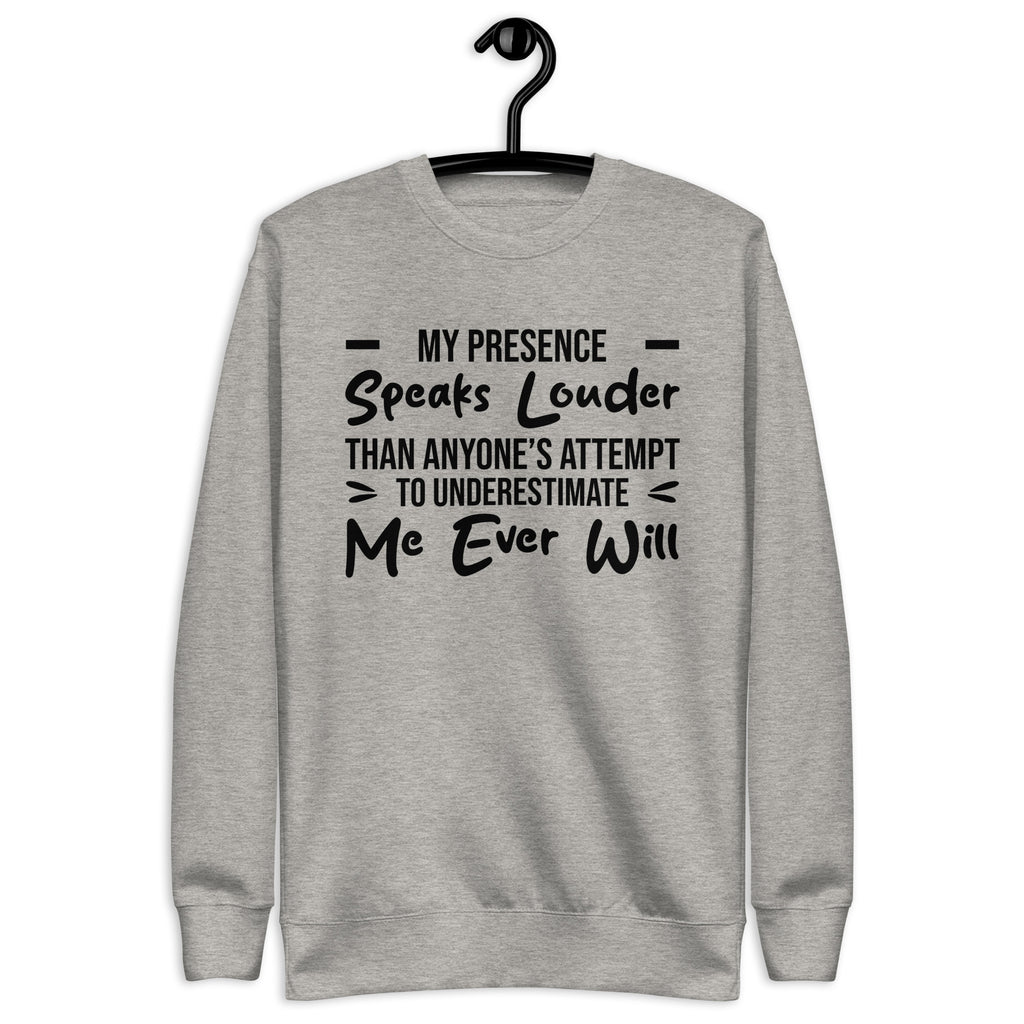 This “My Presence Speaks Louder Than Anyone’s Attempt to Underestimate Me Ever Will” sweatshirt is for the ones who don’t need to prove a thing — their energy does the talking. Powerful, poised, and quietly unstoppable, it’s made for those who rise above doubt with grace and strength that can’t be ignored.
