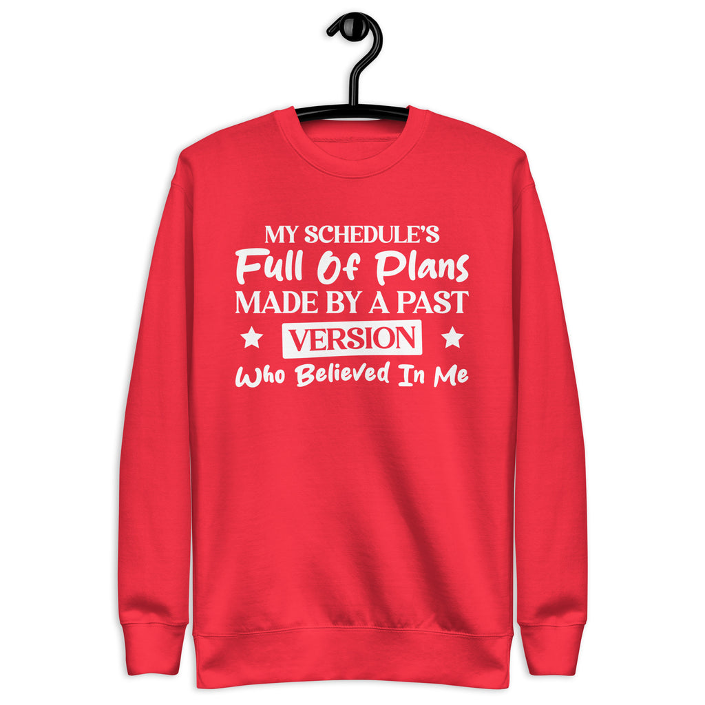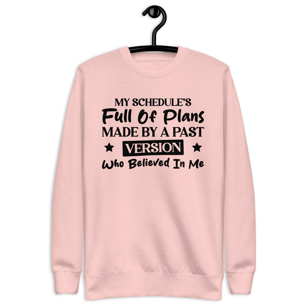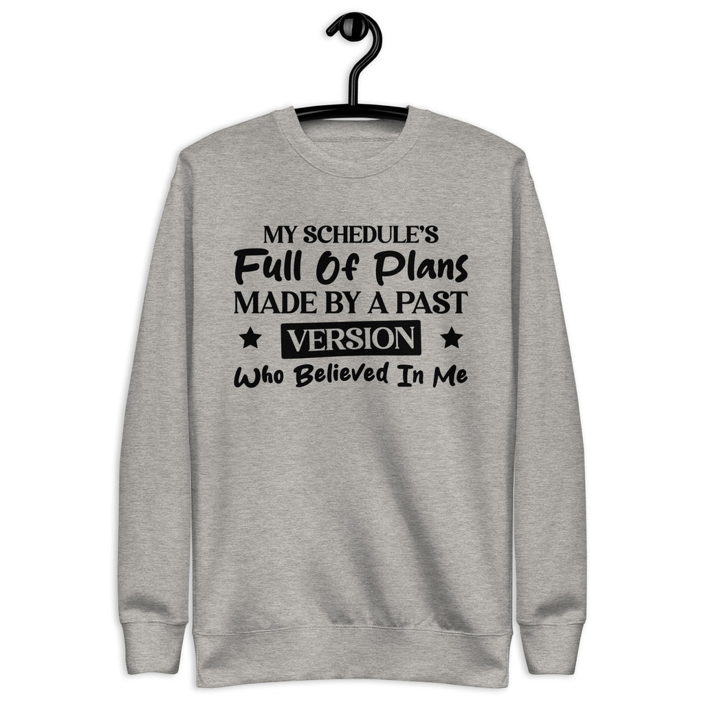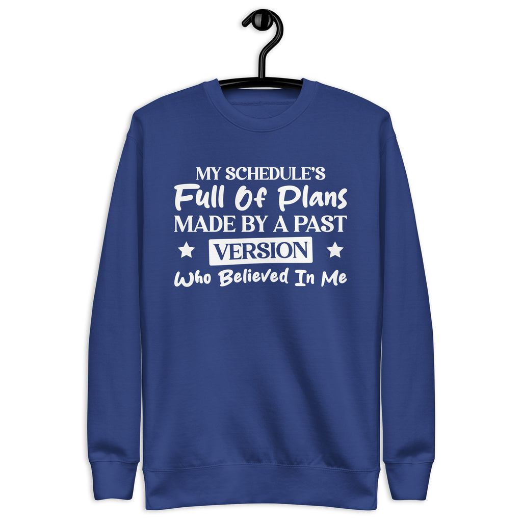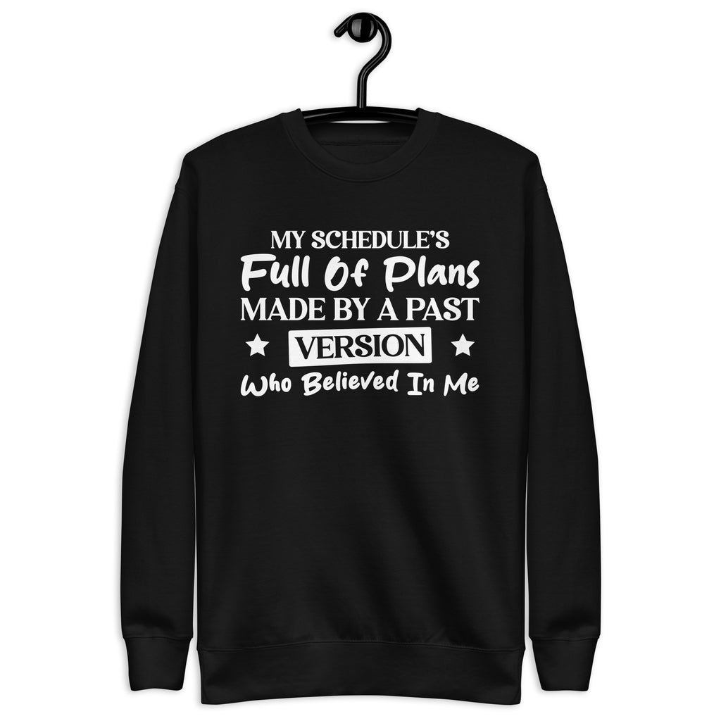 Overbooked, overcommitted, and mildly betrayed by your past self — this “My Schedule’s Full of Plans Made by a Past Version Who Believed in Me” sweatshirt is made for anyone currently paying the price for yesterday’s optimism. You’re not disorganized — you’re just stuck carrying out commitments made by someone who clearly had more energy and ambition.