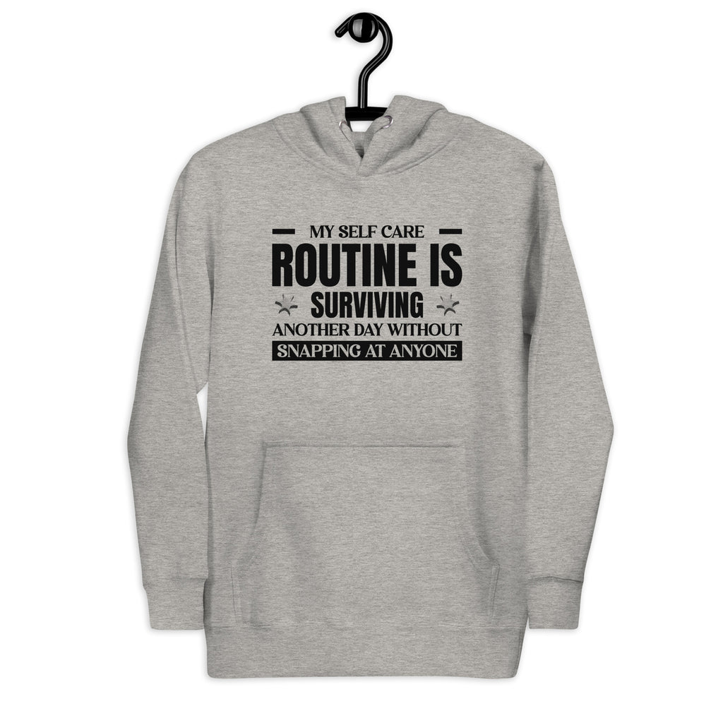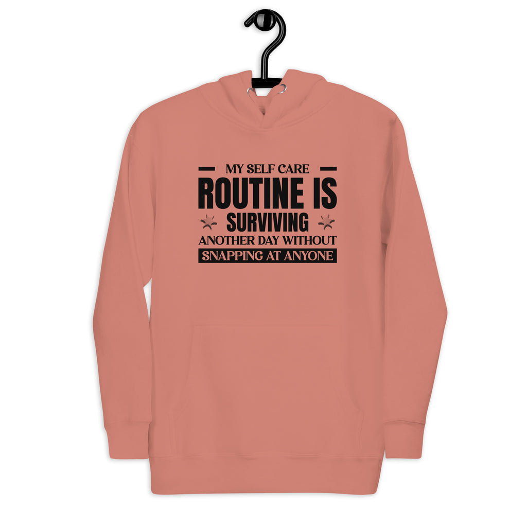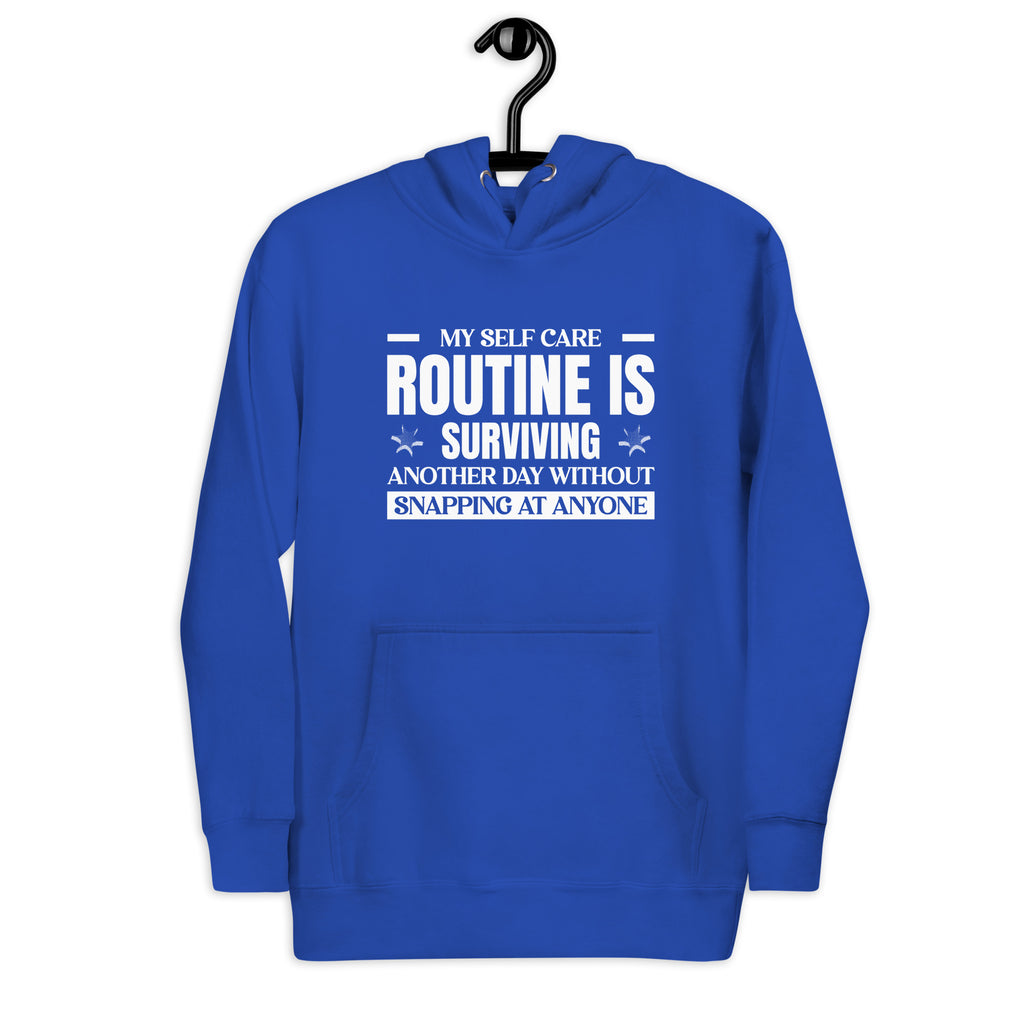 Some people light candles, meditate, or soak in bubble baths… your self-care routine is far more heroic. This “My Self Care Routine Is Surviving Another Day Without Snapping at Anyone” hoodie perfectly sums up the daily emotional endurance test known as being around people.