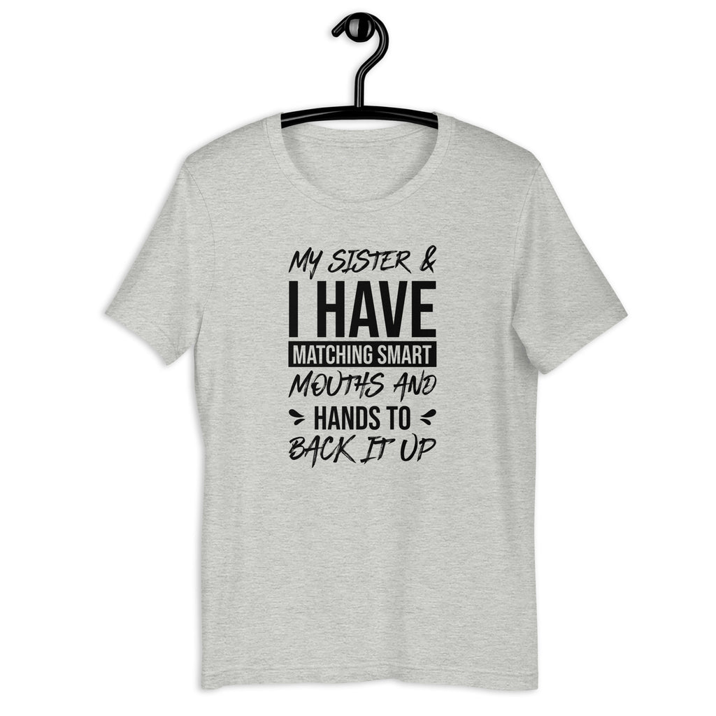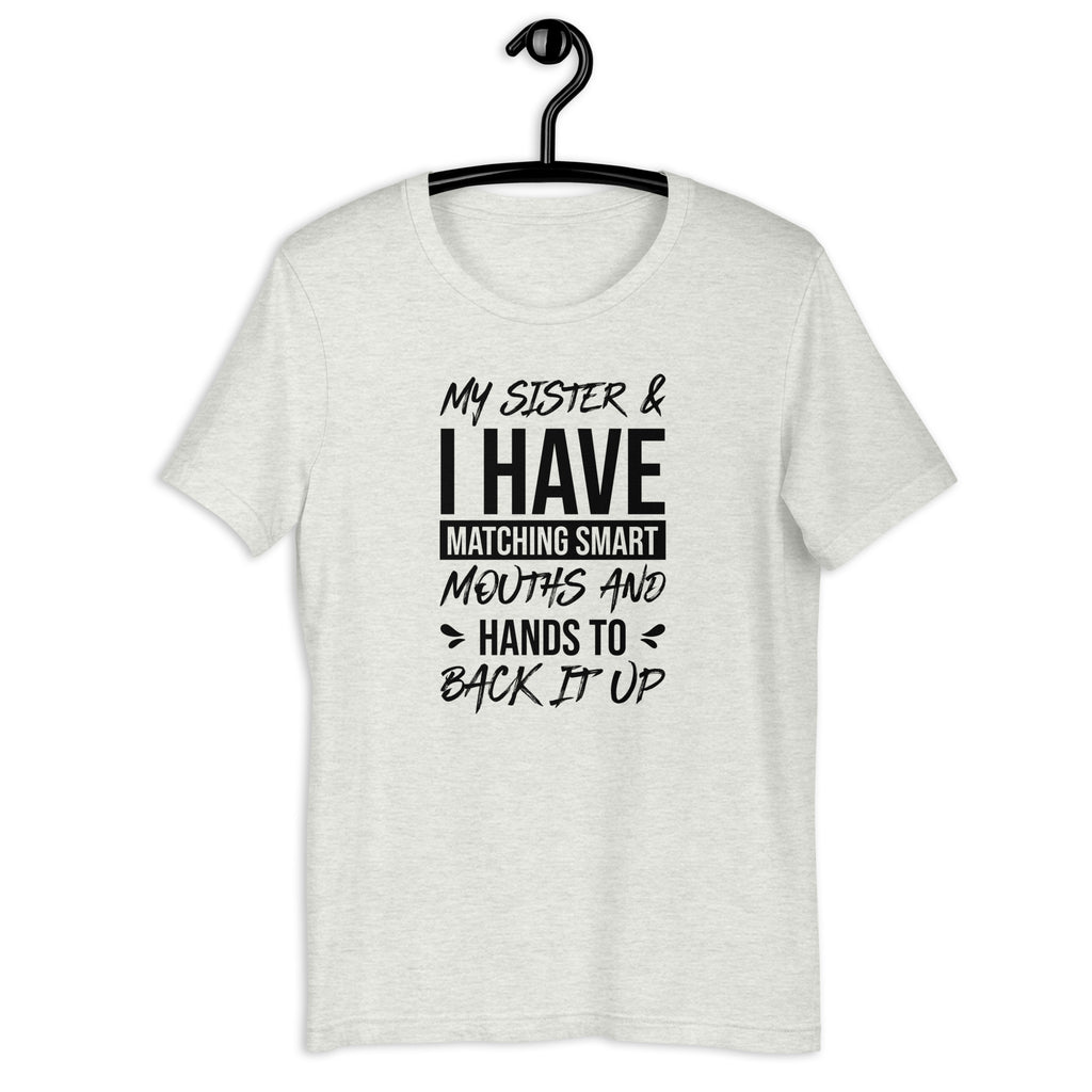 Double the sass, double the backup. The “My Sister and I Have Matching Smart Mouths and Hands to Back It Up” t-shirt is perfect for sisters who share more than just DNA—they share the same bold attitude. It’s funny, fierce, and the ultimate way to show off that ride-or-die sibling bond.