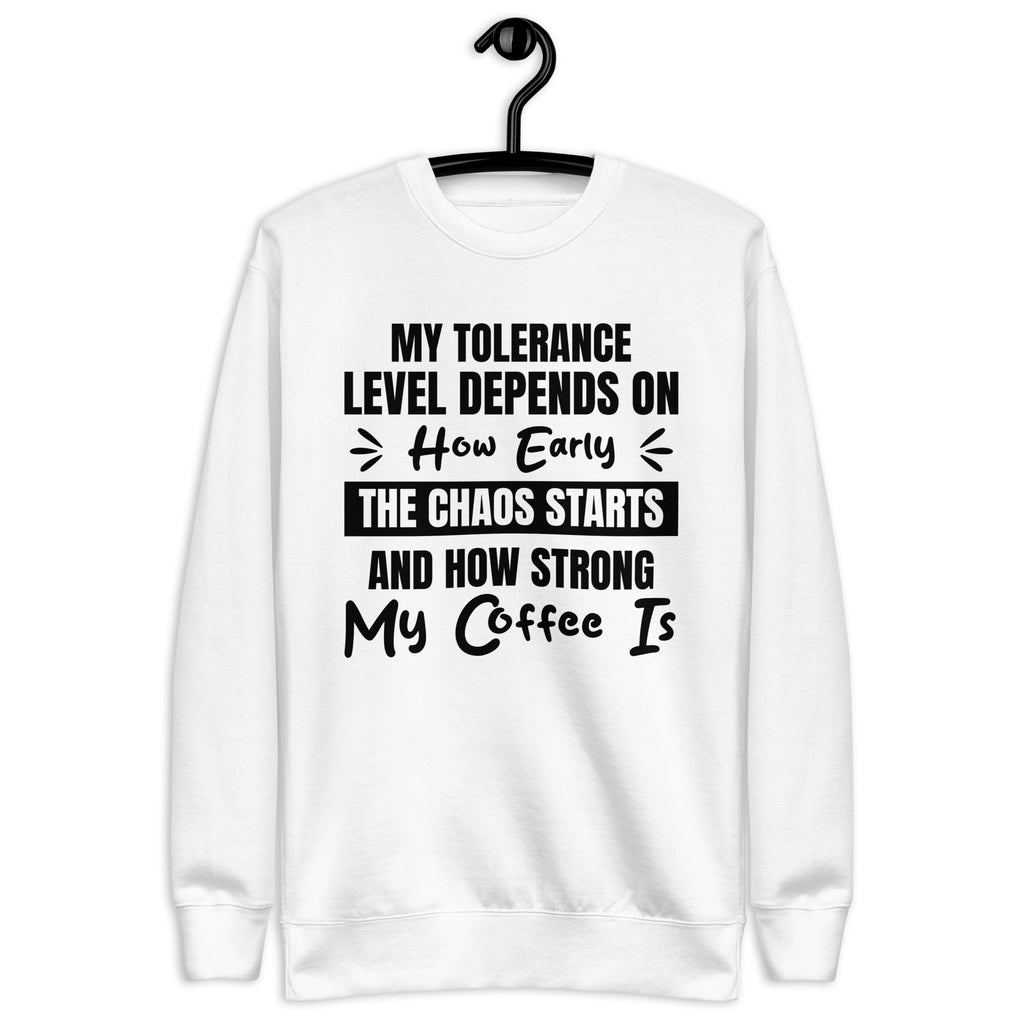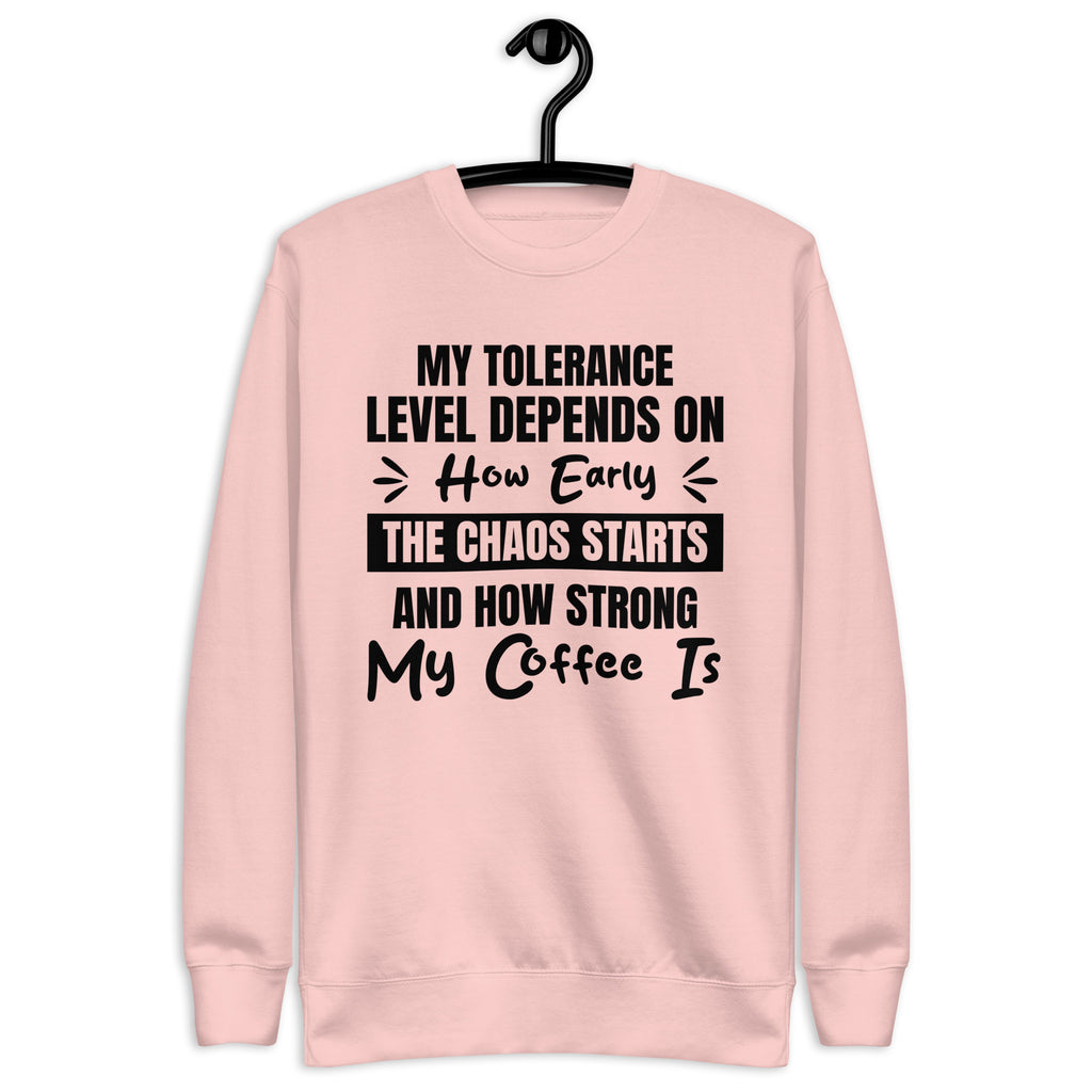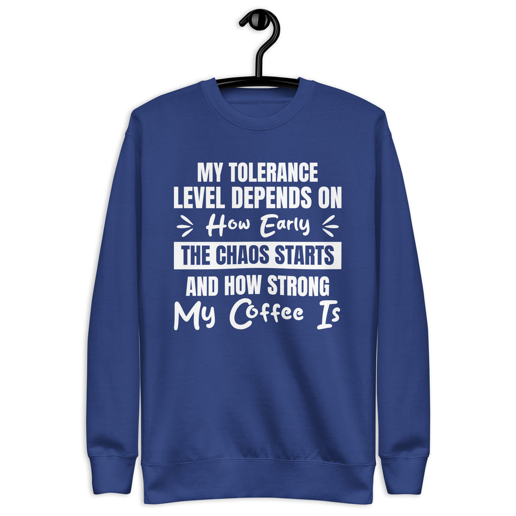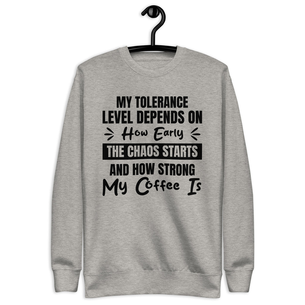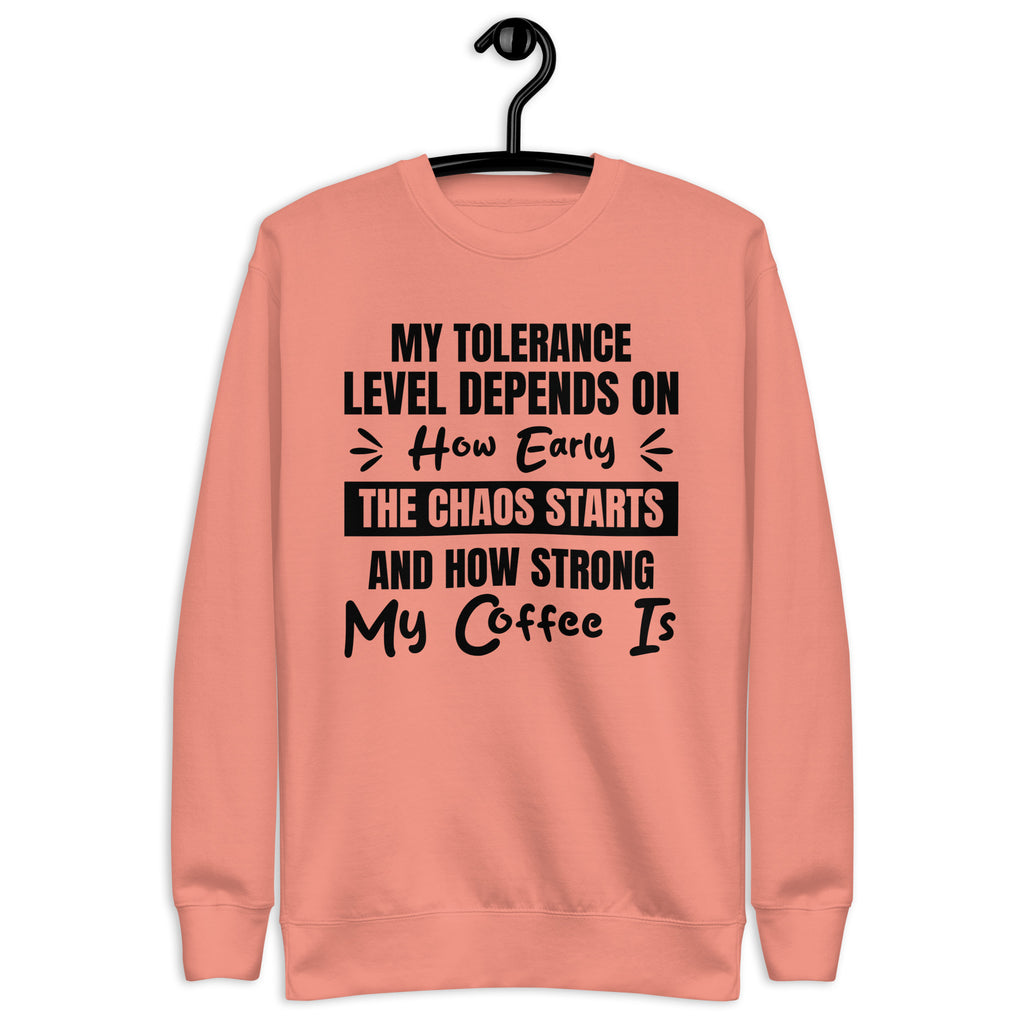 Balanced, candid, and a little caffeine-dependent — this “My Tolerance Level Depends on How Early the Chaos Starts and How Strong My Coffee Is” sweatshirt is made for anyone who measures patience by the cup. You’re not short-tempered — you’re simply operating on a delicate formula of caffeine, calm, and whatever madness the day throws at you.