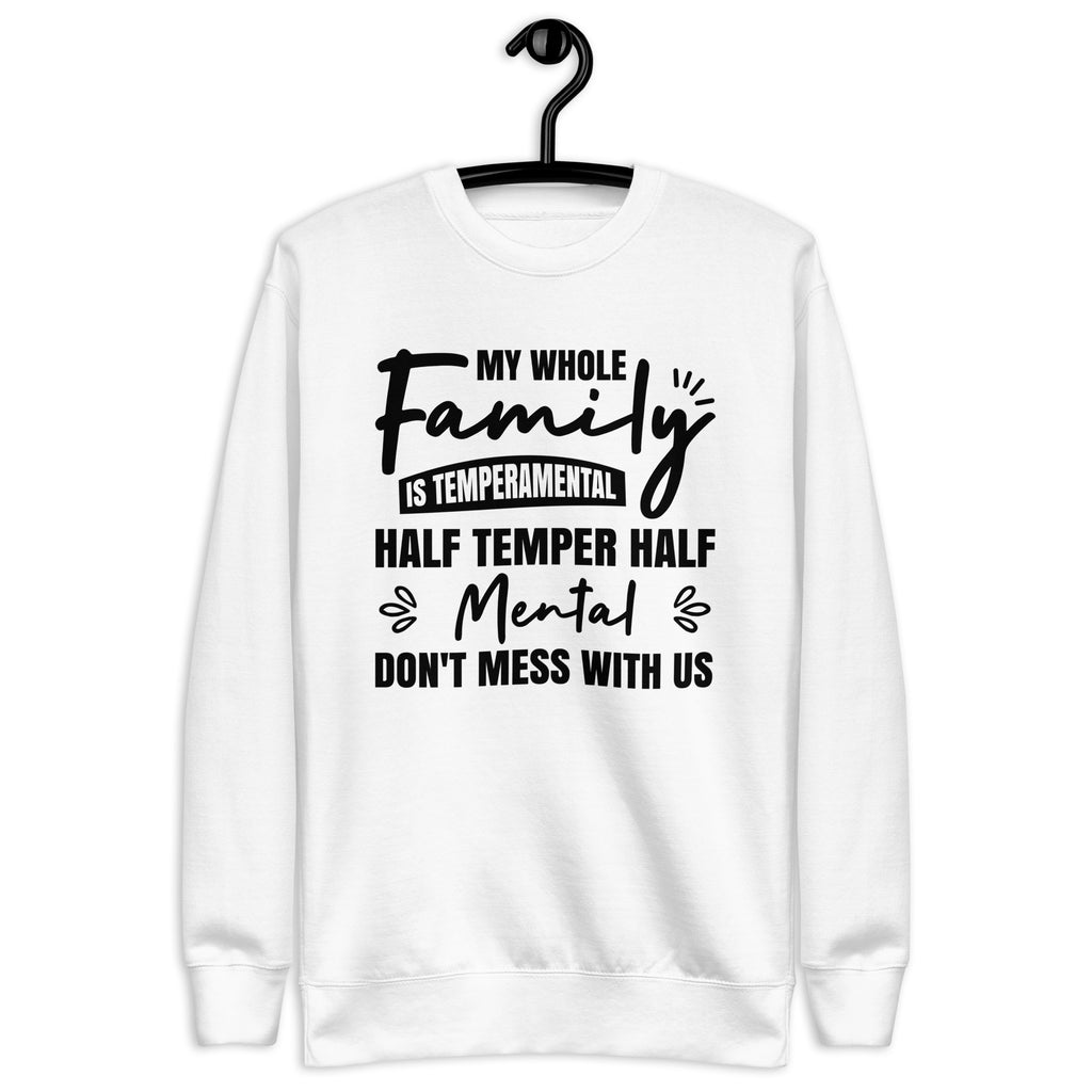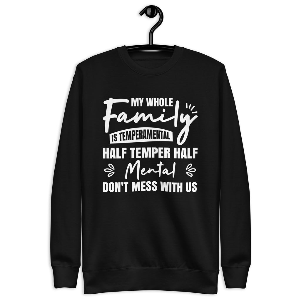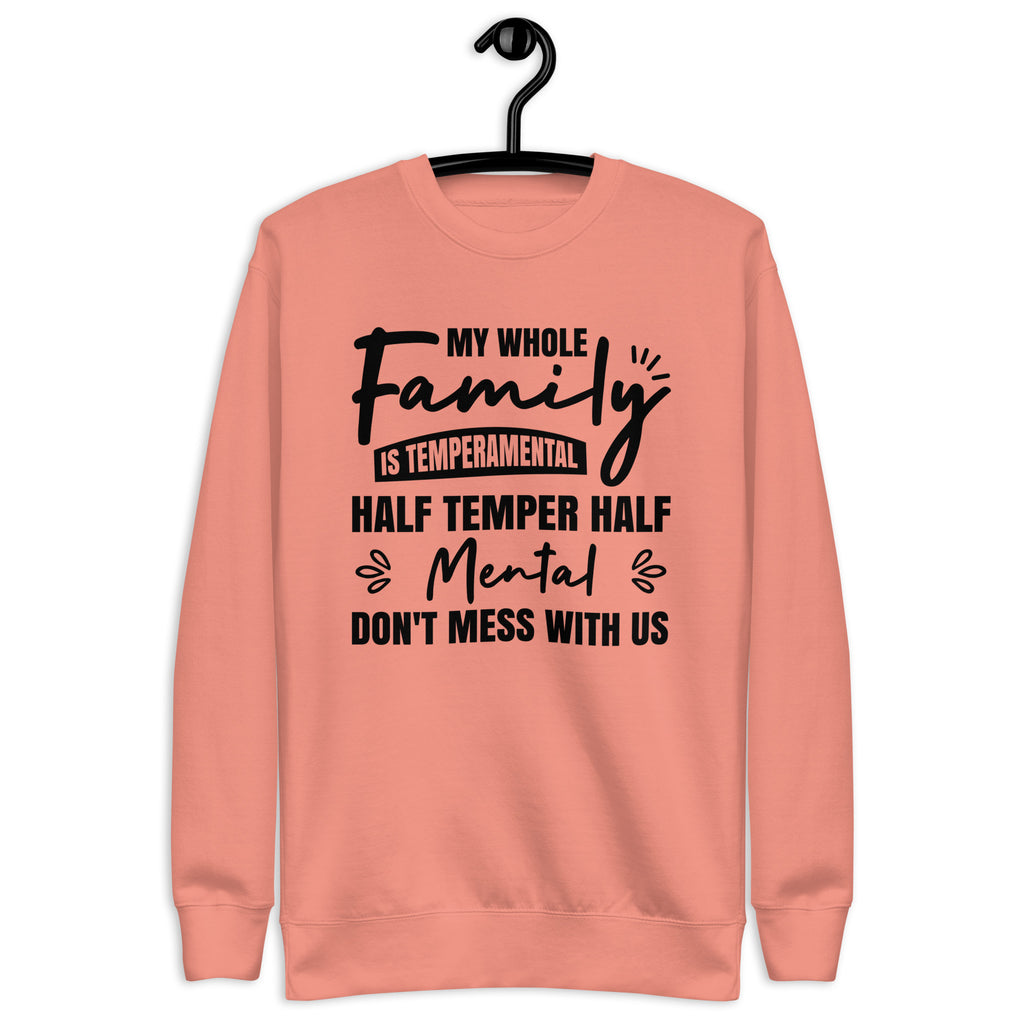 Funny, bold, and full of attitude. The “My Whole Family Is Temperamental — Half Temper, Half Mental. Don’t Mess With Us” sweatshirt is made for those who proudly embrace their quirky, fiery family dynamic. It delivers humor and personality with confidence, letting everyone know your crew is not to be trifled with.