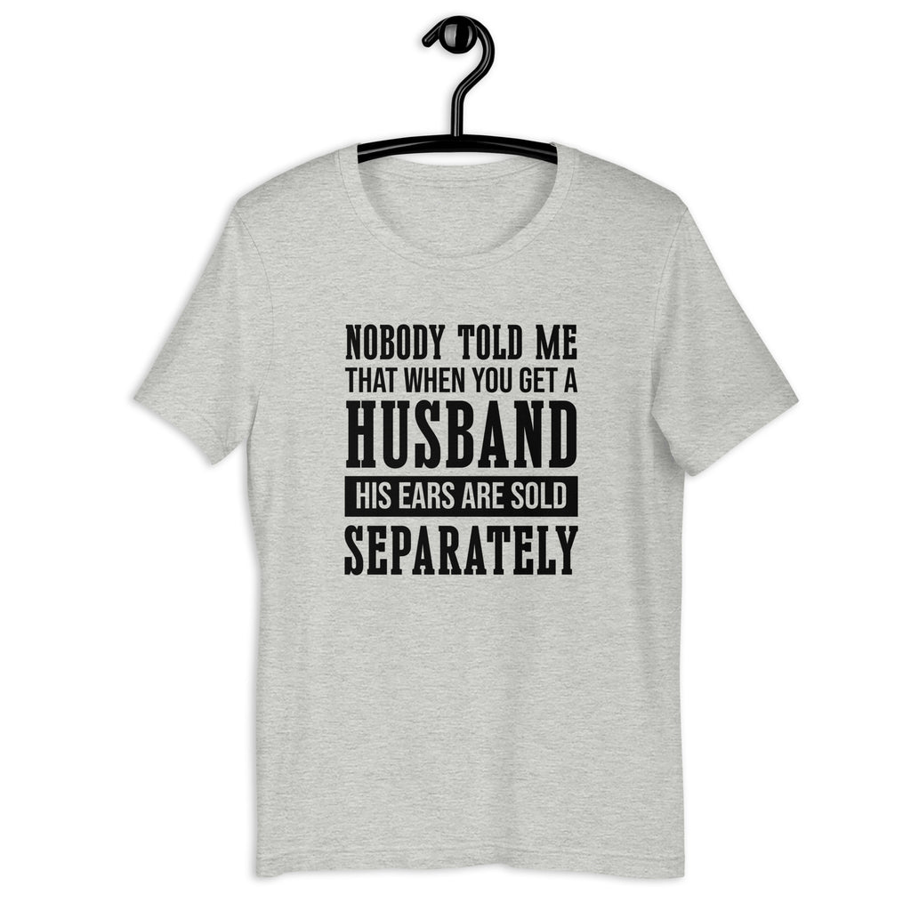 Marriage comes with plenty of surprises—like finding out your husband’s ears don’t actually come included! The “Nobody Told Me That When You Get a Husband His Ears Are Sold Separately” t-shirt is the perfect blend of sass and humor for wives who know the struggle. A playful way to vent (and laugh) about selective hearing, this tee makes a hilarious gift for anniversaries, bridal showers, or just everyday wear.