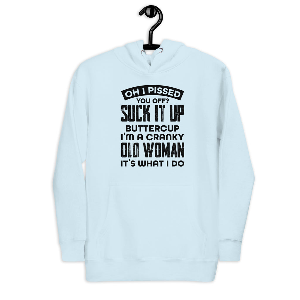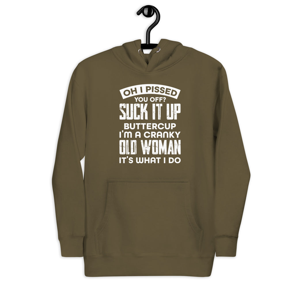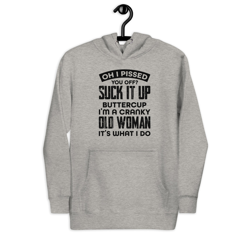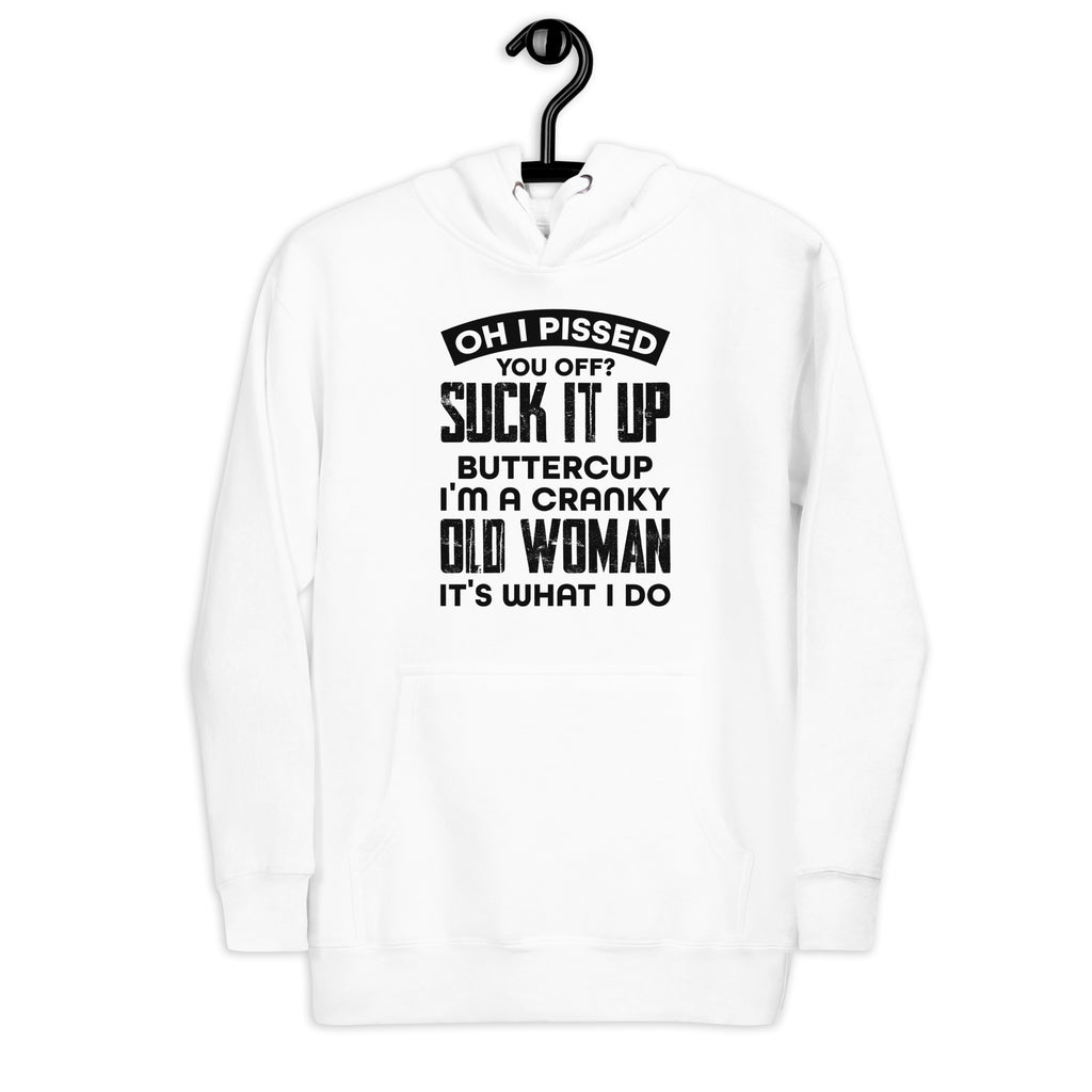 Show off your sass and seasoned wisdom with the “Oh, I Pissed You Off? Suck It Up, Buttercup — I’m a Cranky Old Woman, It’s What I Do” hoodie. This funny, no-nonsense design is perfect for women who’ve earned the right to say exactly what they think — and don’t apologize for it.