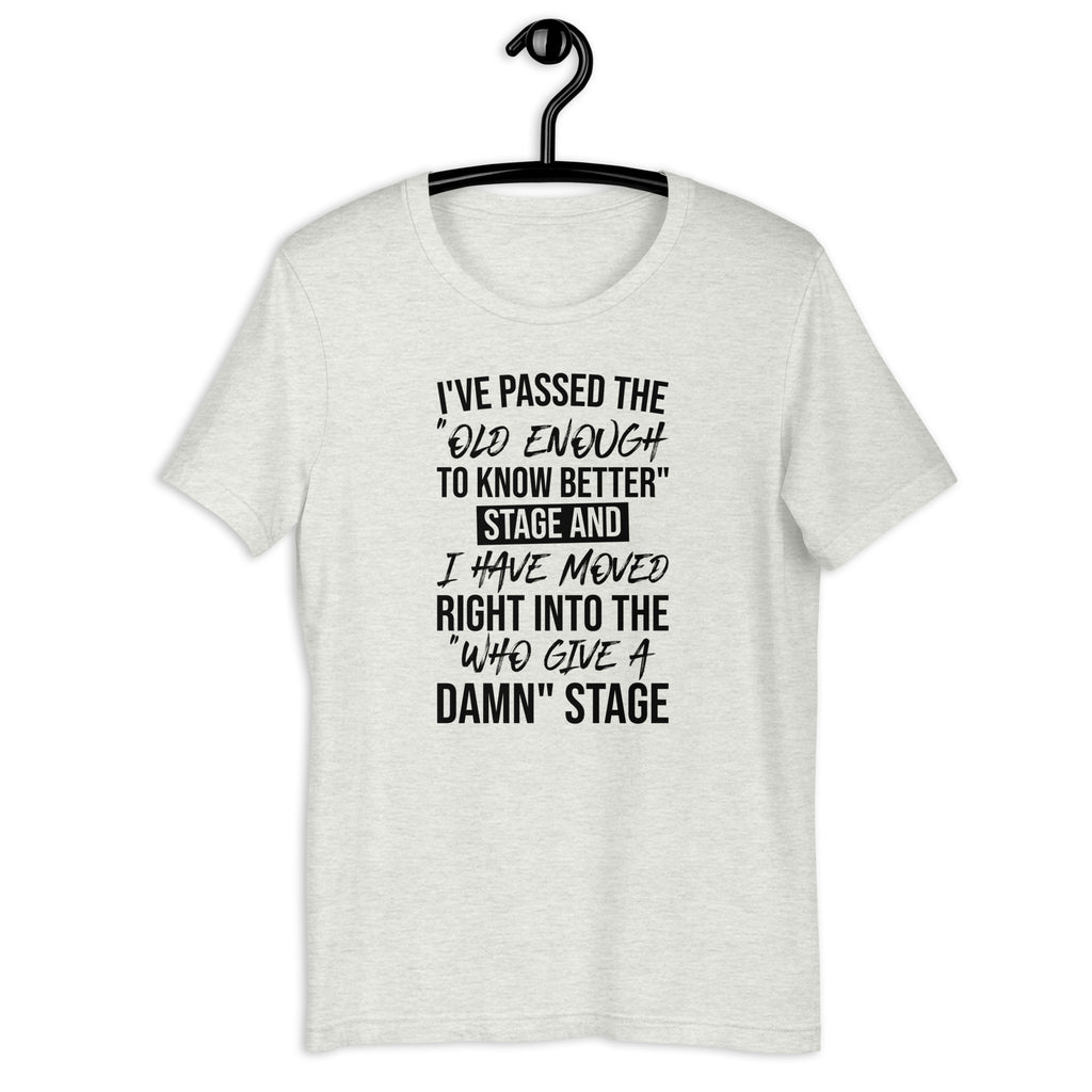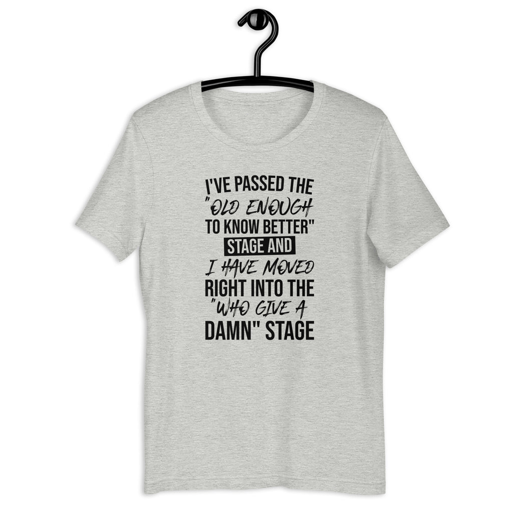Celebrate your carefree spirit with the “Old Enough to Know Better Who Gives a Damn Stage Tee. This witty design is perfect for anyone who’s earned the right to stop caring what others think and start living life on their own terms.