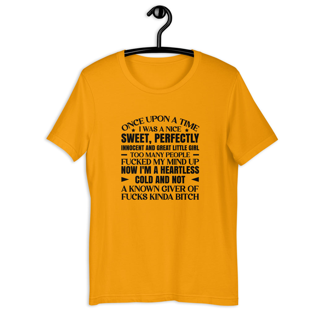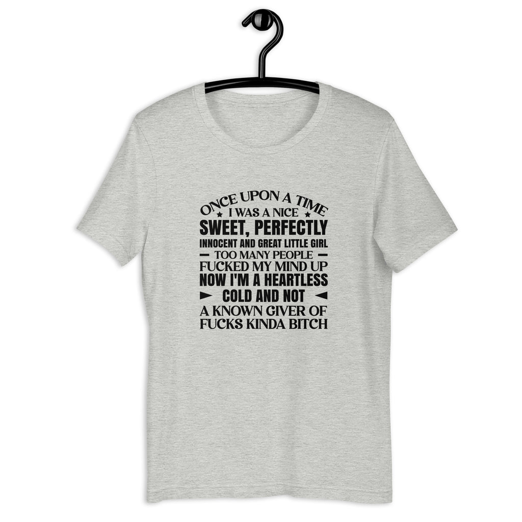 Reveal a story of transformation with the “Once Upon a Time I Was a Nice, Sweet, Perfectly Innocent Girl… Then Life Happened” T-shirt. Made for anyone who didn’t choose the savage life—but had it forced on them by people who pushed too far—this tee celebrates resilience, attitude, and a zero-fucks-given upgrade.