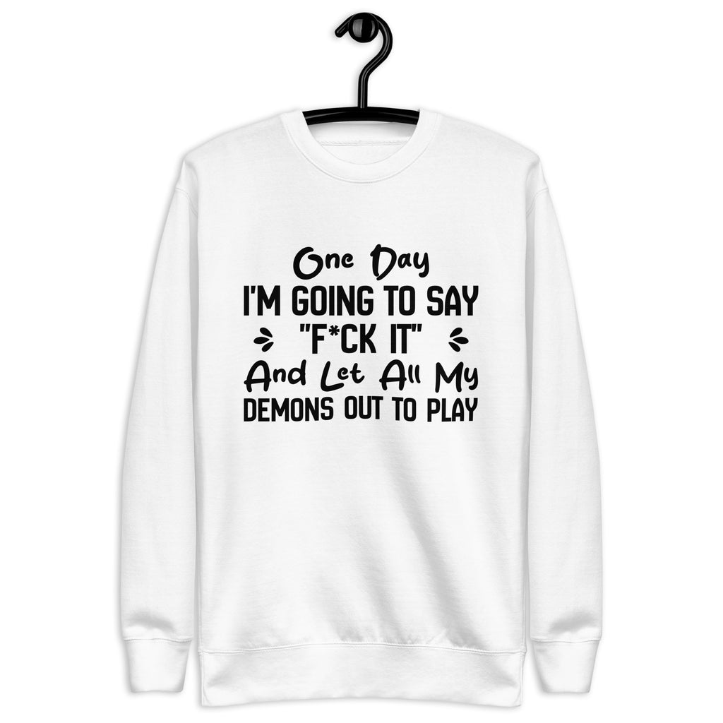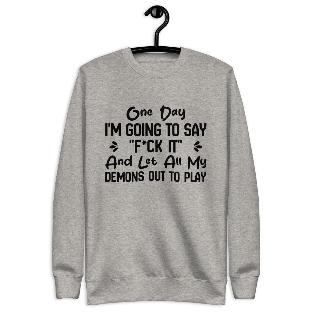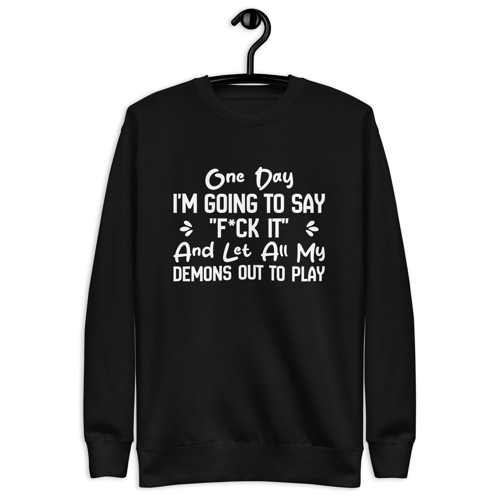 Dark, unapologetic, and full of attitude. The “One Day I’m Going to Say ‘F*ck It’ and Let All My Demons Out to Play” sweatshirt is for those who know the chaos lurking beneath the surface—and aren’t afraid to own it. It’s a bold declaration of embracing your wild side, even if just for a moment.