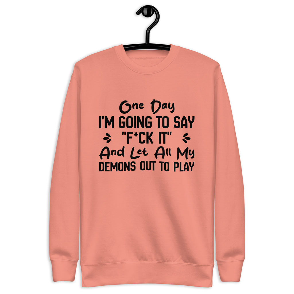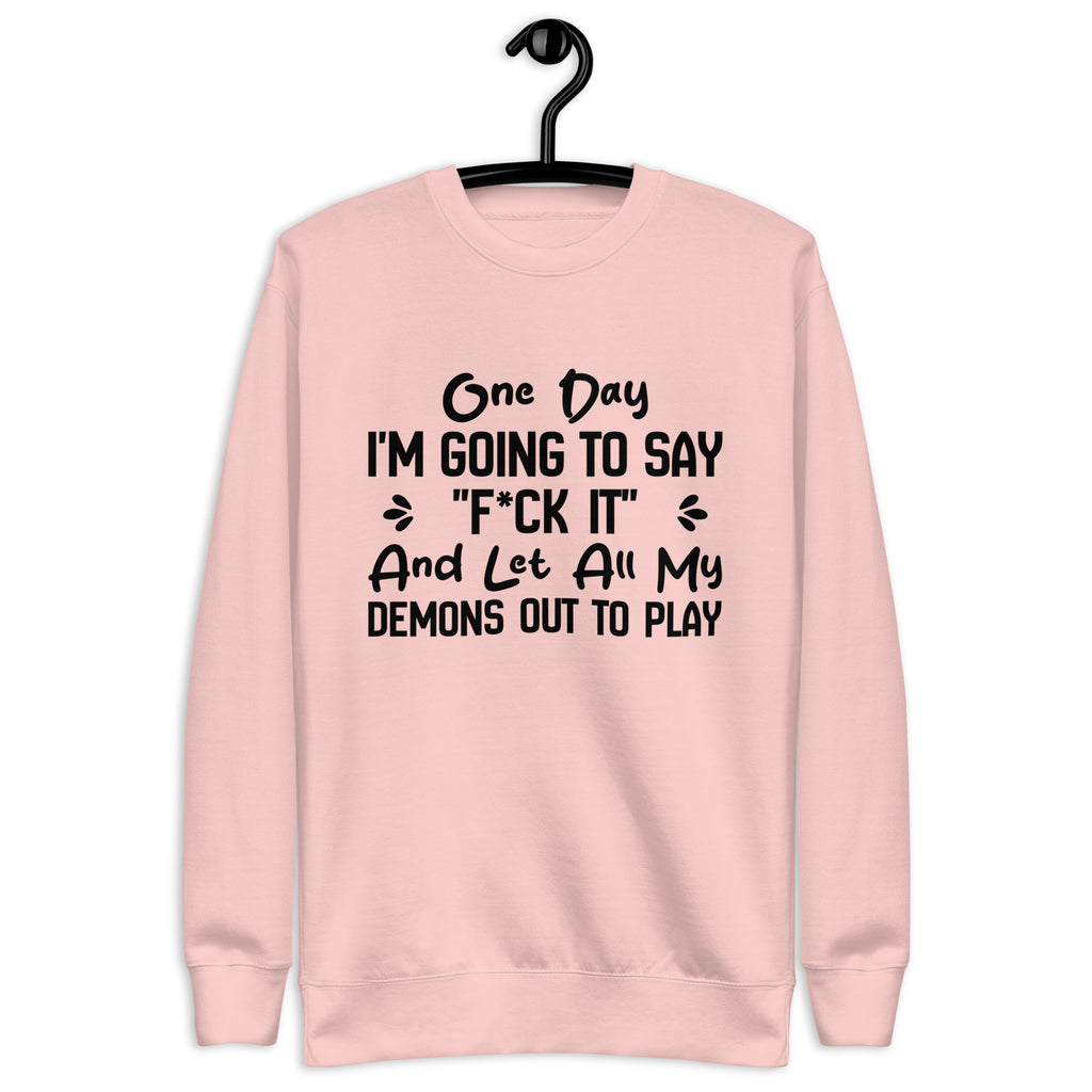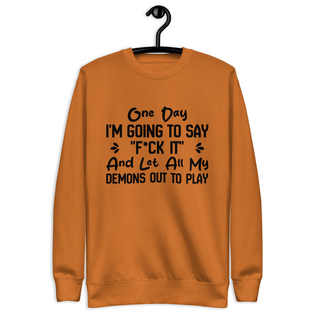 Dark, unapologetic, and full of attitude. The “One Day I’m Going to Say ‘F*ck It’ and Let All My Demons Out to Play” sweatshirt is for those who know the chaos lurking beneath the surface—and aren’t afraid to own it. It’s a bold declaration of embracing your wild side, even if just for a moment.