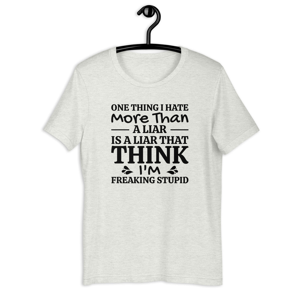 Call it like it is with the “One Thing I Hate More Than a Liar Is a Liar That Thinks I’m Freaking Stupid” t-shirt. Perfect for anyone who can spot the BS a mile away, this tee makes your no-nonsense attitude loud and clear.