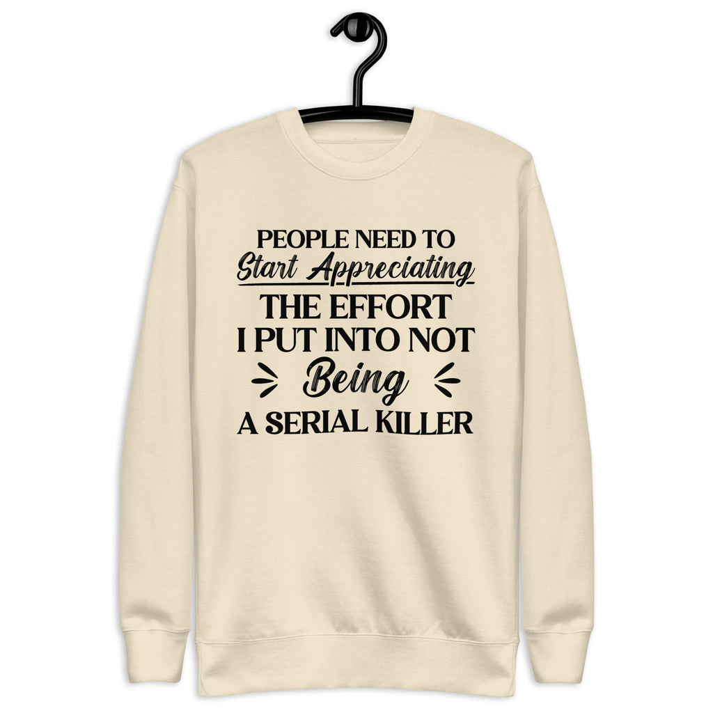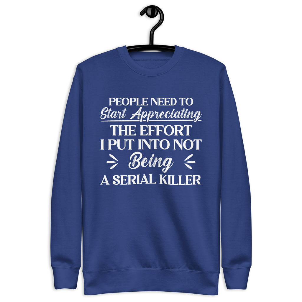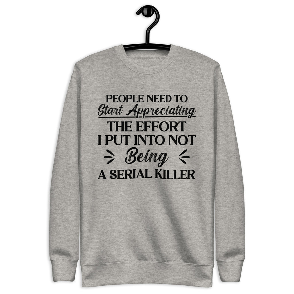 A cozy dose of dark humor. The “People Need to Start Appreciating the Effort I Put Into Not Being a Serial Killer” sweatshirt is witty, sarcastic, and just the right mix of savage and funny. Perfect for anyone who knows they deserve extra credit for keeping their cool, this sweatshirt makes a statement that’s impossible to ignore.