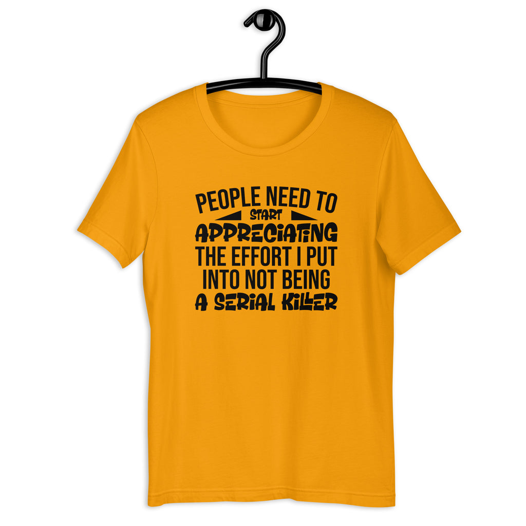 Dark humor meets everyday attitude with the “People Need to Start Appreciating the Effort I Put Into Not Being a Serial Killer” t-shirt. Perfect for those who keep it real and cope with life’s nonsense using sarcasm, this shirt says exactly what you’re thinking—but in the funniest way possible.