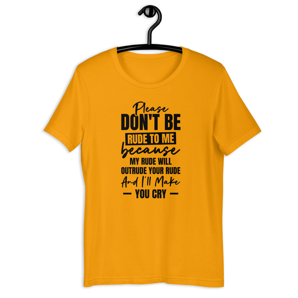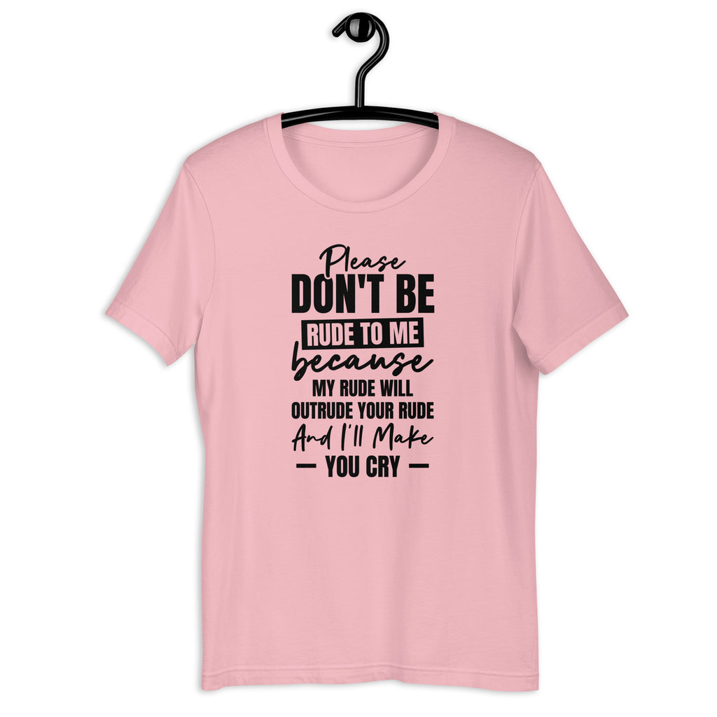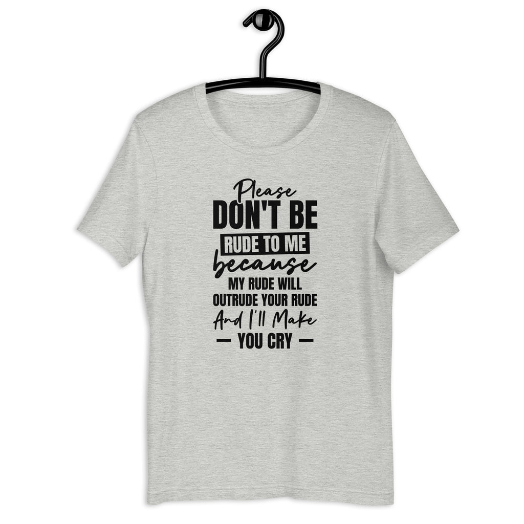 Keep your sass sharp and your comebacks ready with this “Please don’t be rude to me — my rude will outrude your rude and you will cry” t-shirt. Perfect for anyone with a fierce sense of humor and zero patience for petty nonsense, this cheeky tee delivers attitude with a grin — and warns would-be troublemakers to think twice.