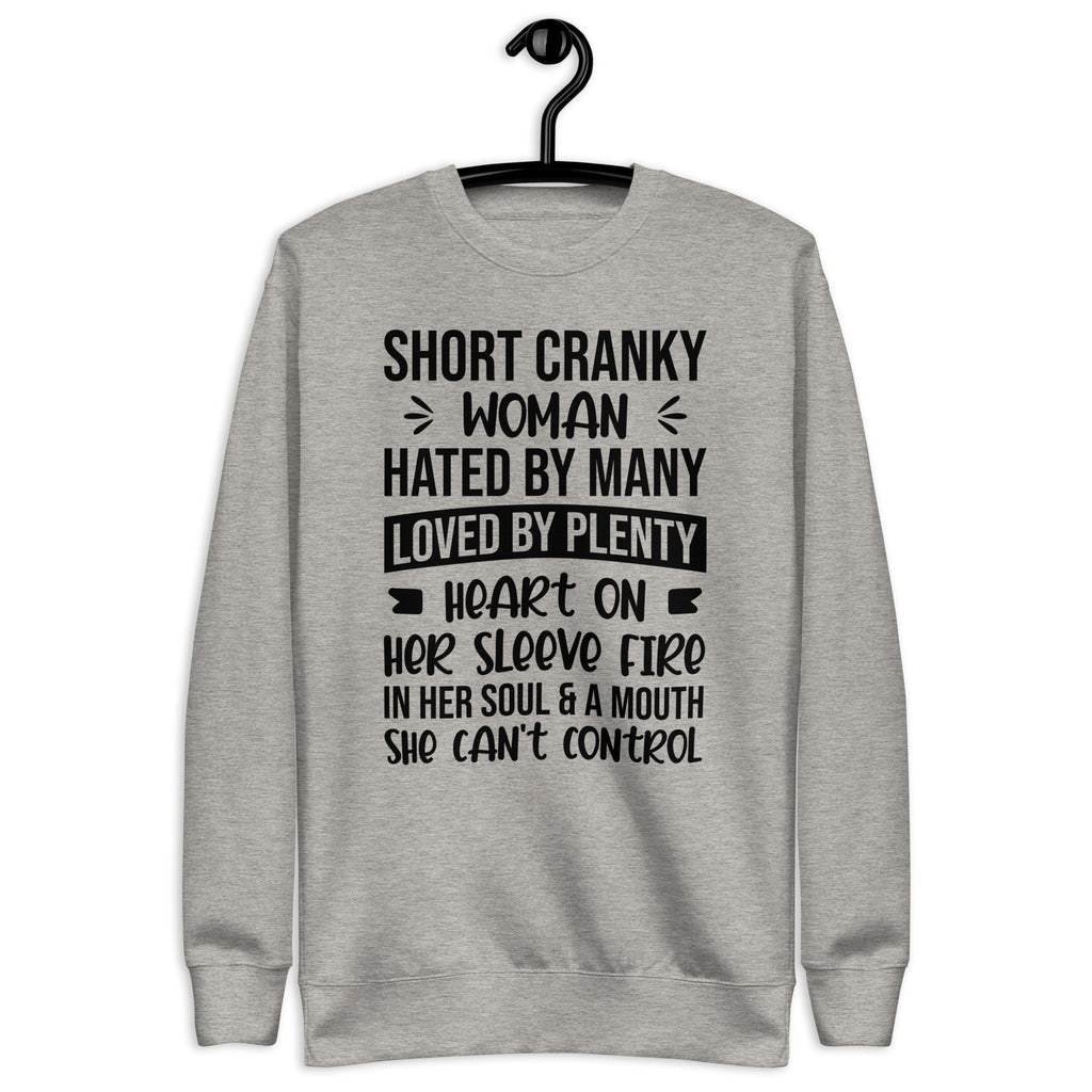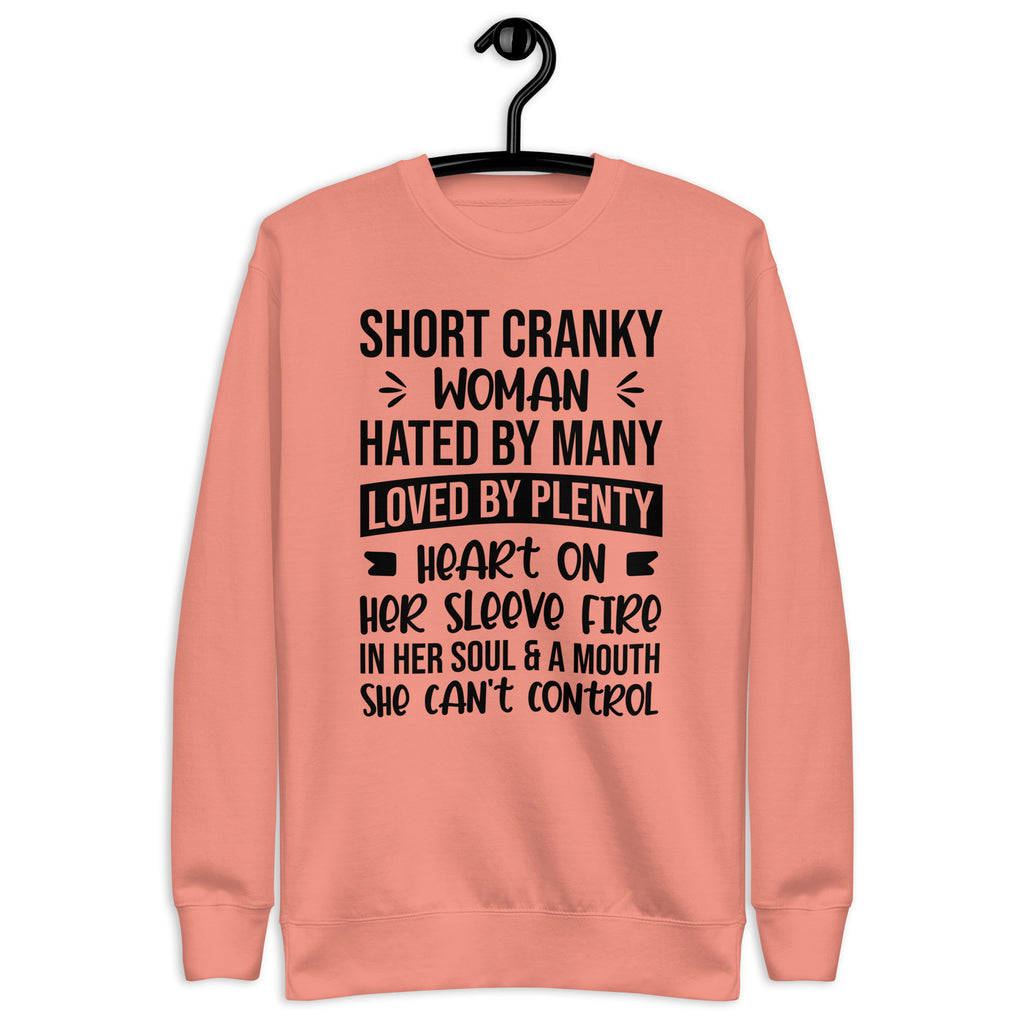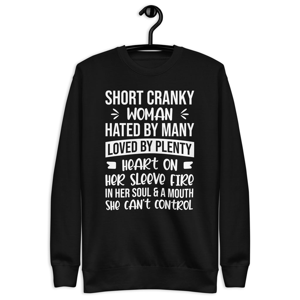 Own your fiery personality with the “Short, Cranky Woman — Hated by Many, Loved by Plenty, Heart on Her Sleeve, Fire in Her Soul, and a Mouth She Can’t Control” sweatshirt. This bold and empowering design is perfect for women who are unapologetically themselves — a little feisty, a little sassy, and full of heart.