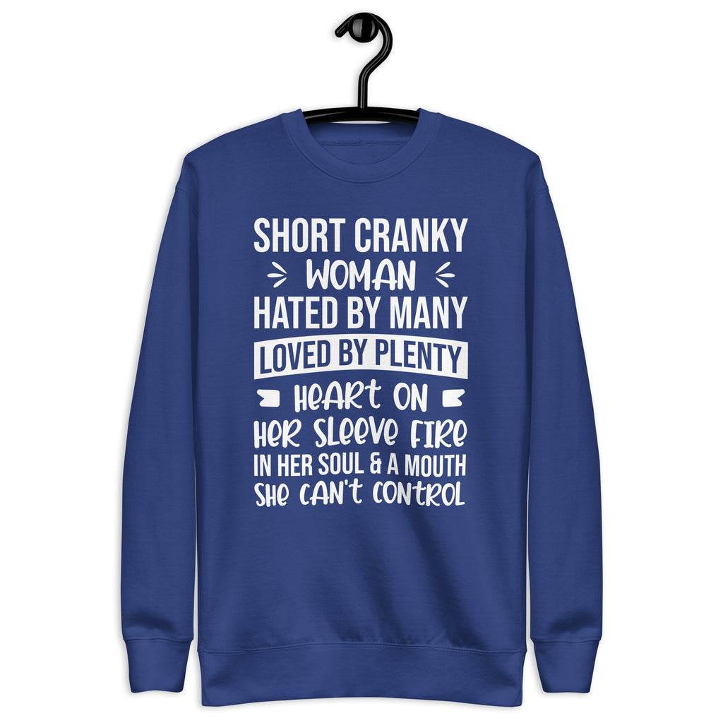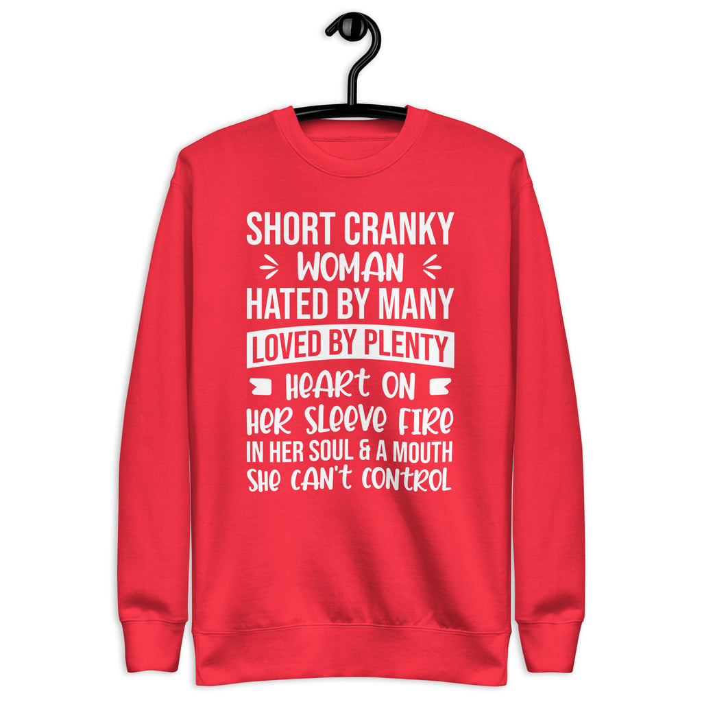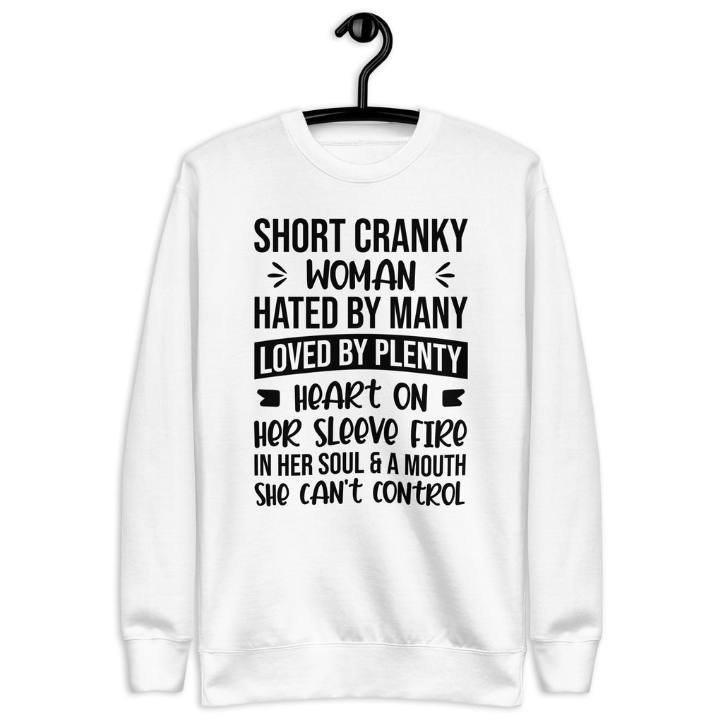 Own your fiery personality with the “Short, Cranky Woman — Hated by Many, Loved by Plenty, Heart on Her Sleeve, Fire in Her Soul, and a Mouth She Can’t Control” sweatshirt. This bold and empowering design is perfect for women who are unapologetically themselves — a little feisty, a little sassy, and full of heart.
