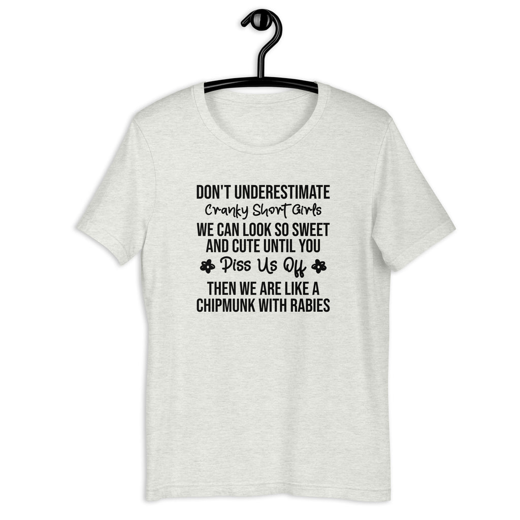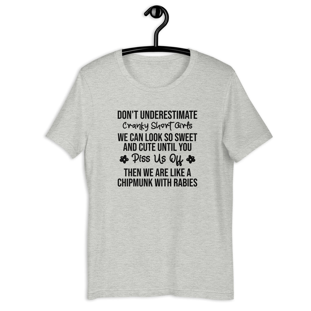 Small but mighty! The “Don’t Underestimate Cranky Short Girls—We Can Look So Sweet and Cute Until You Piss Us Off” t-shirt is the perfect blend of sass and attitude. Cute on the outside but fierce when pushed, this tee is made for short queens who know exactly how to stand their ground.