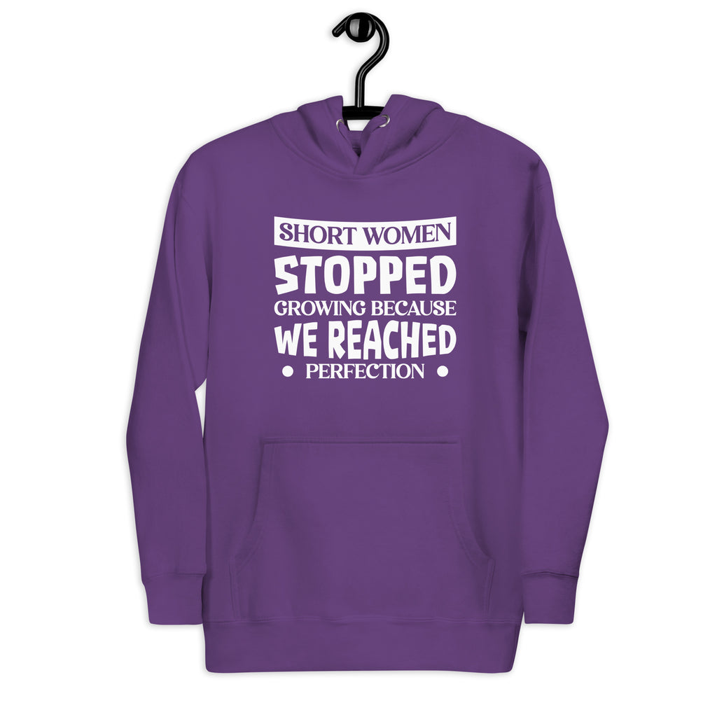 Celebrate fun-sized perfection with this “Short Women Stopped Growing Because We Reached Perfection” hoodie! Perfect for all the confident, petite queens who know that great things come in small packages, this hoodie serves equal parts sass, humor, and self-love.