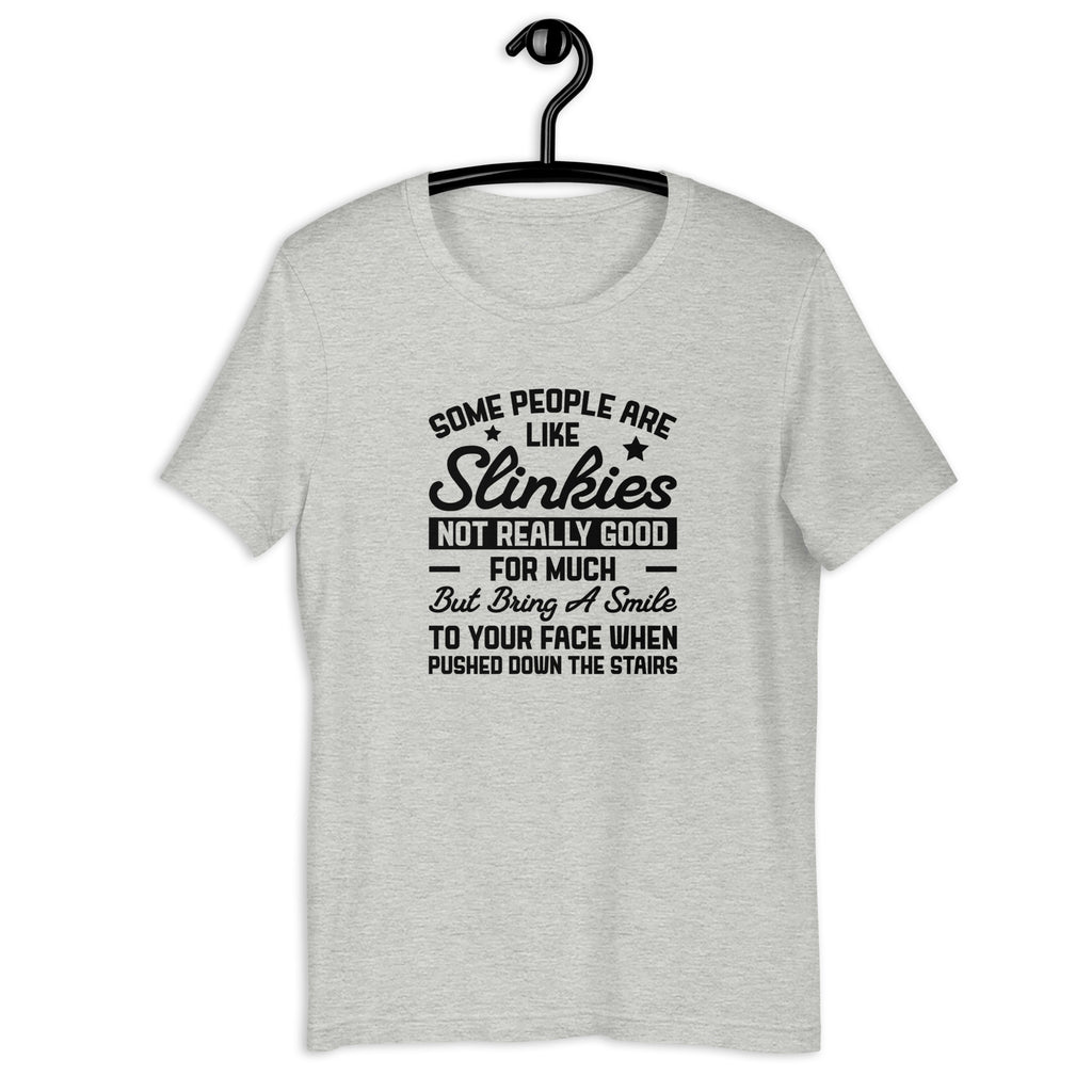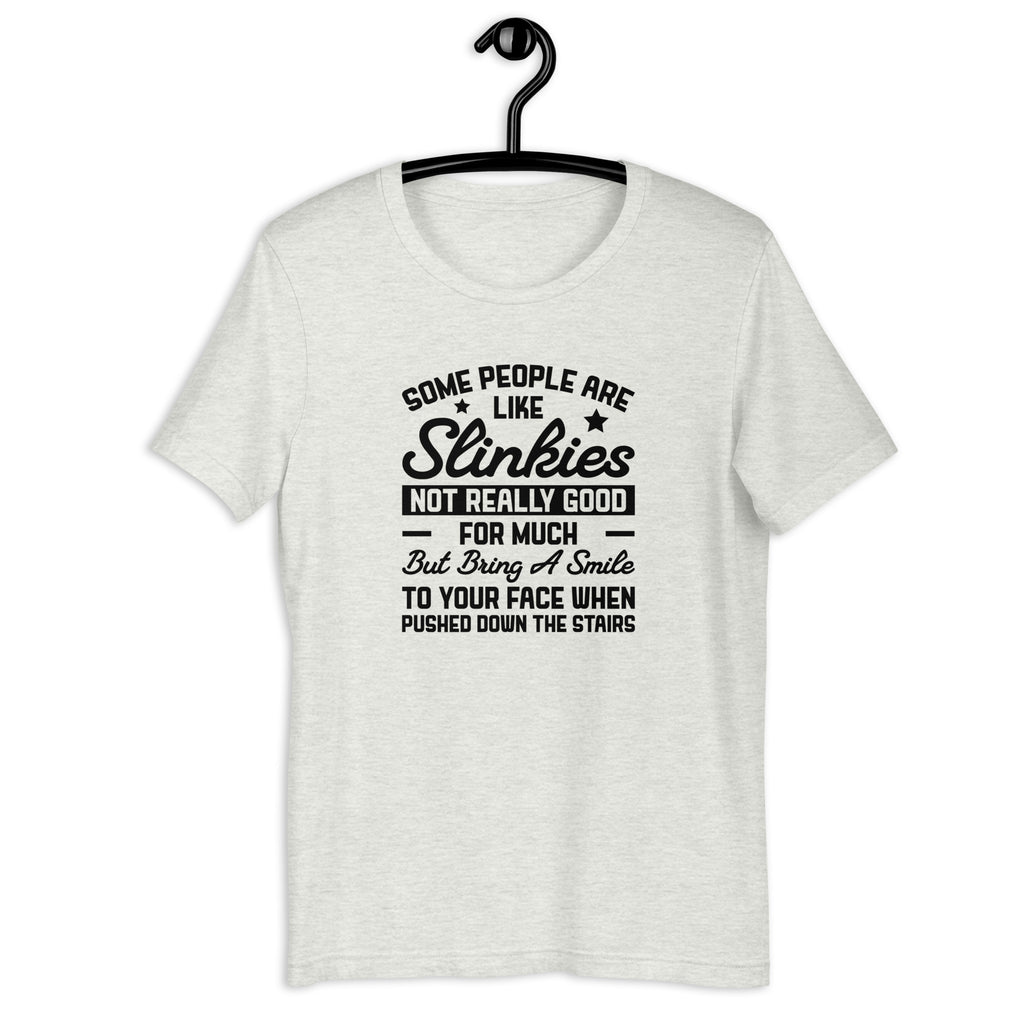 Bring out your dark humor with the “Some People Are Like Slinkies… Not Really Good for Much, But They Still Make You Smile” T-shirt — the perfect tee for anyone who handles annoyance with sarcasm and a twist of mischief. This design captures that iconic, tongue-in-cheek comparison we all secretly understand: some folks are just entertaining by existing… and occasionally by imagining them in dramatic cartoon scenarios.