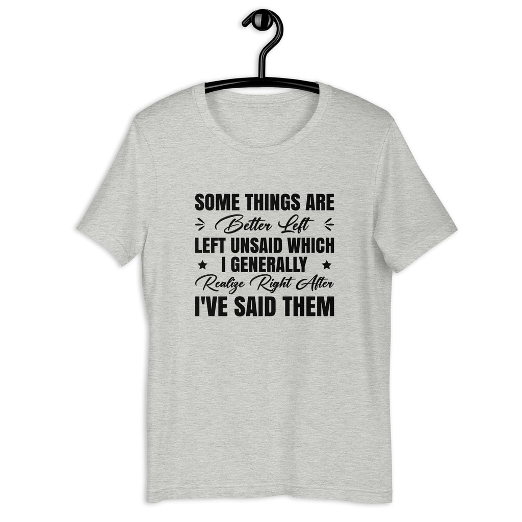 Turn self-awareness into humor with the “Some Things Are Better Left Unsaid… Which I Generally Realize Right After I’ve Said Them” T-shirt. Perfect for anyone whose mouth moves faster than their filter, this tee captures that all-too-familiar moment of instant regret with a wink.