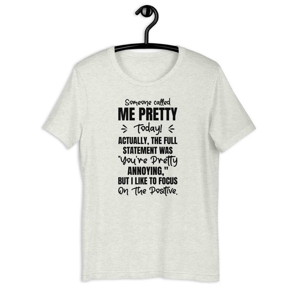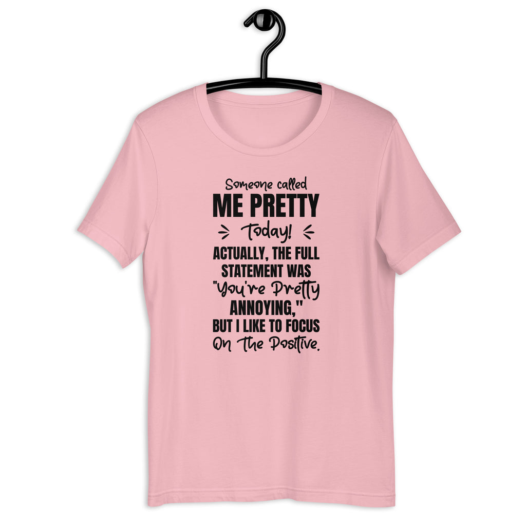 how off your hilarious optimism with the “Someone Called Me Pretty Today. Actually, the Full Statement Was ‘You’re Pretty Annoying,’ But I Like to Focus on the Positives” T-shirt. Perfect for anyone who can laugh at themselves and spin an insult into a compliment, this tee delivers humor, sass, and confidence all in one.