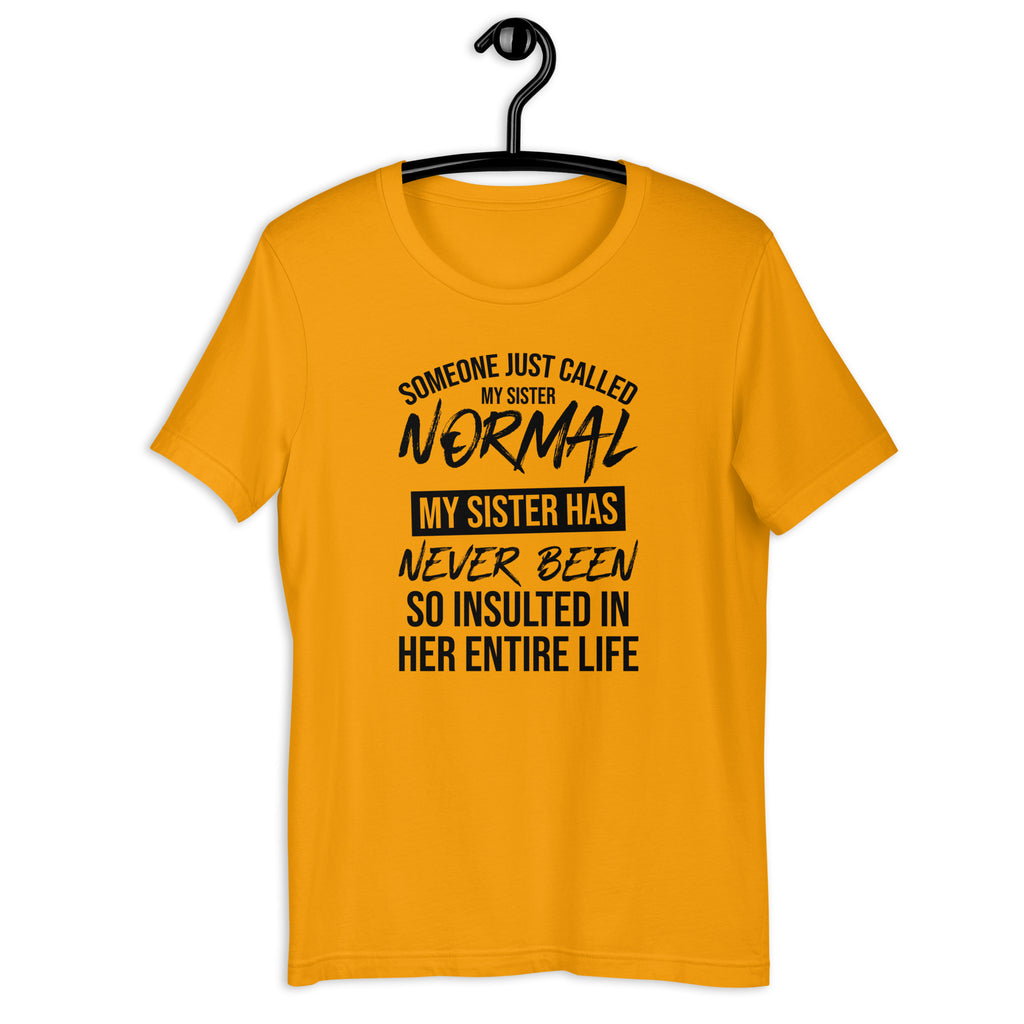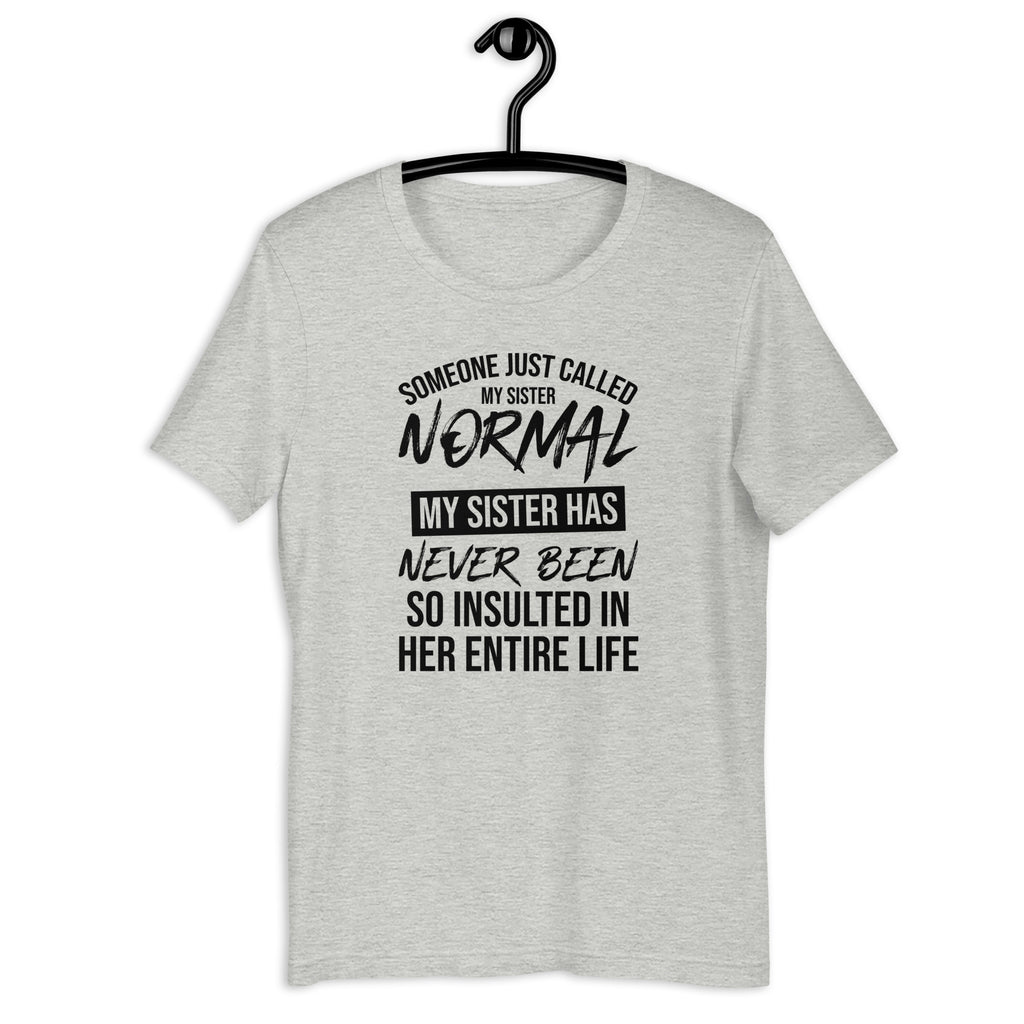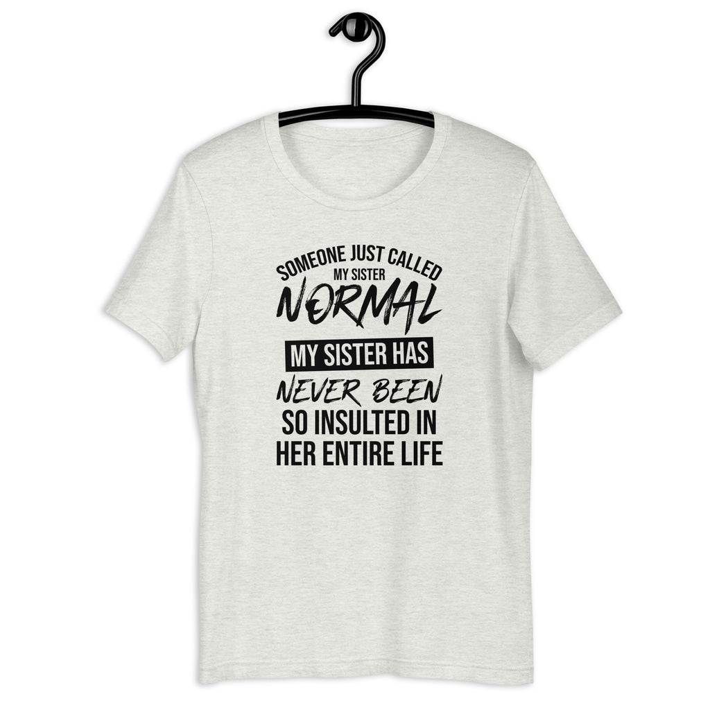 Celebrate sibling pride with the “Someone Just Called My Sister Normal—She’s Never Been So Insulted in Her Entire Life” t-shirt. Perfect for sisters who embrace their quirks, this tee is a hilarious way to show off that being “normal” is overrated.