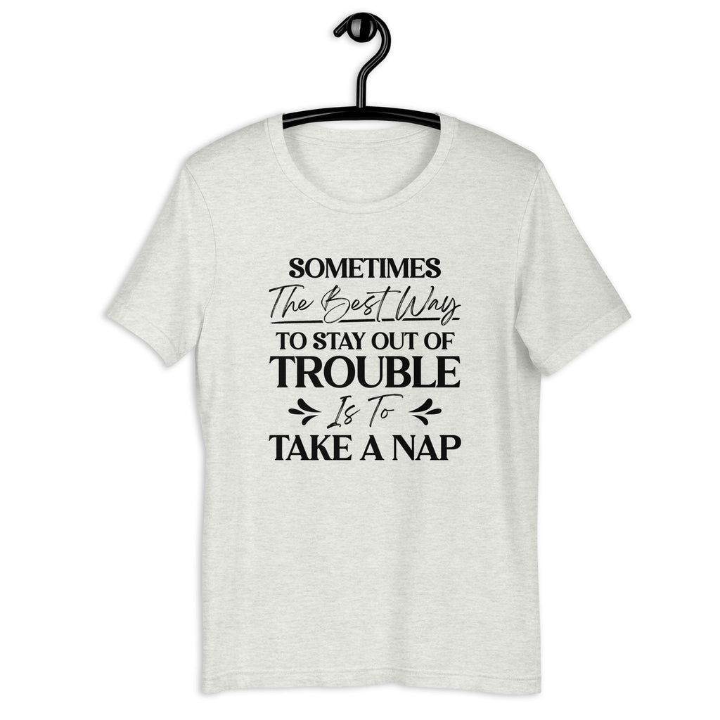 Keep it simple (and out of trouble) with this “Sometimes the Best Way to Stay Out of Trouble Is to Take a Nap” t-shirt. Funny, relatable, and oh-so-comfy, this tee is perfect for anyone who believes that sleep is the ultimate solution.