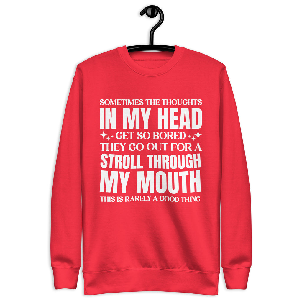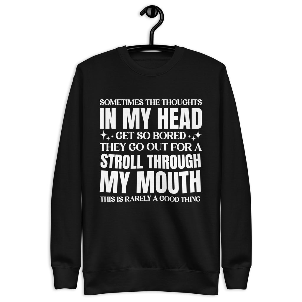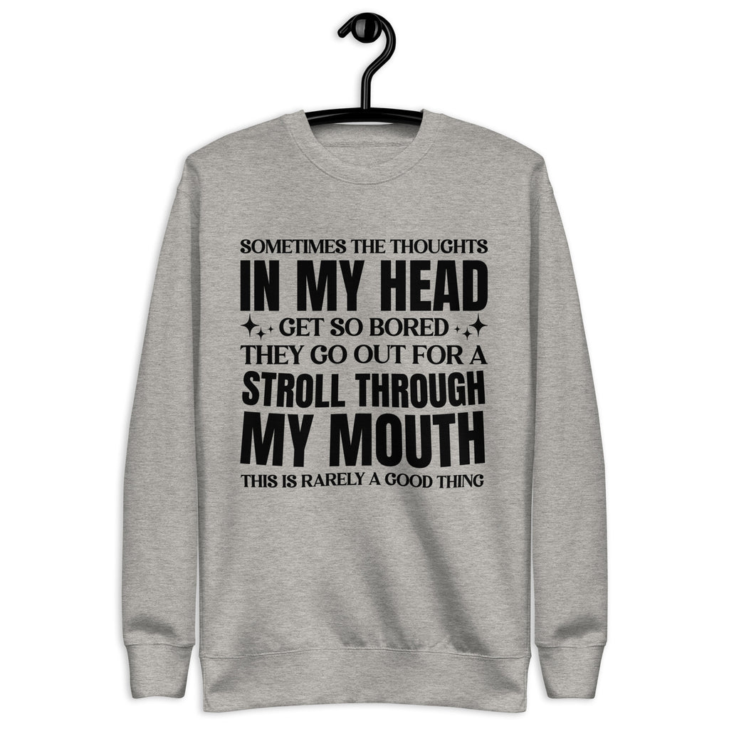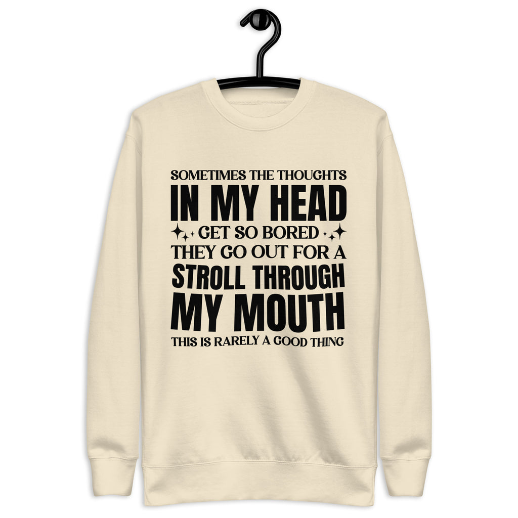 Keep warm while showing off your humor with the “Sometimes the Thoughts in My Head Get So Bored They Go Out for a Stroll Through My Mouth” sweatshirt. Perfect for anyone who speaks before they think (and owns it proudly), this playful design is guaranteed to get laughs and spark conversations.