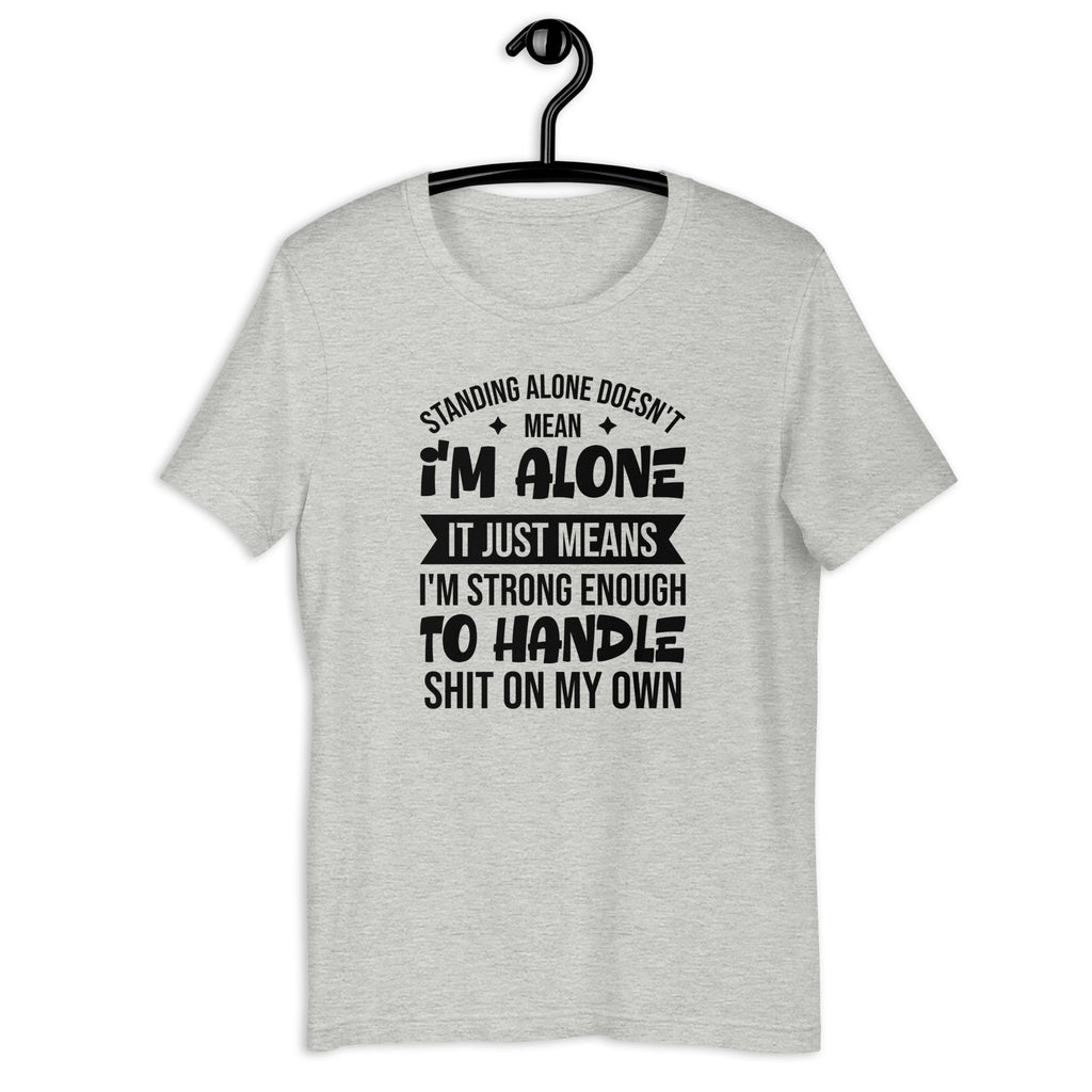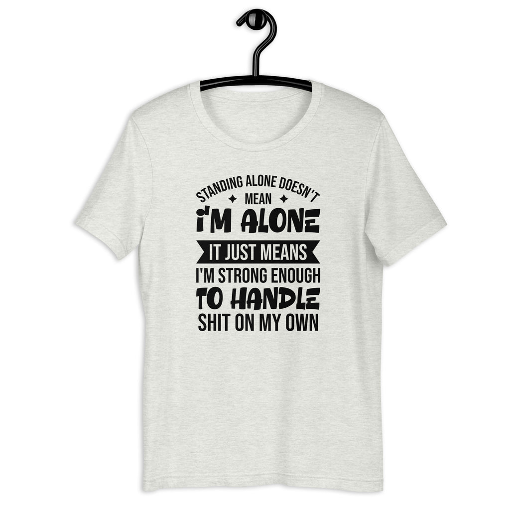 Show off your strength and independence with this “Standing Alone Doesn’t Mean I’m Alone — It Just Means I’m Strong Enough to Handle Sh*t On My Own” t-shirt! Perfect for anyone who’s learned how to survive, grow, and thrive without needing a crowd behind them.