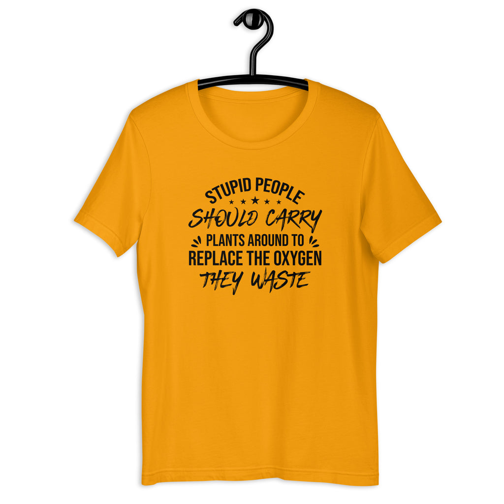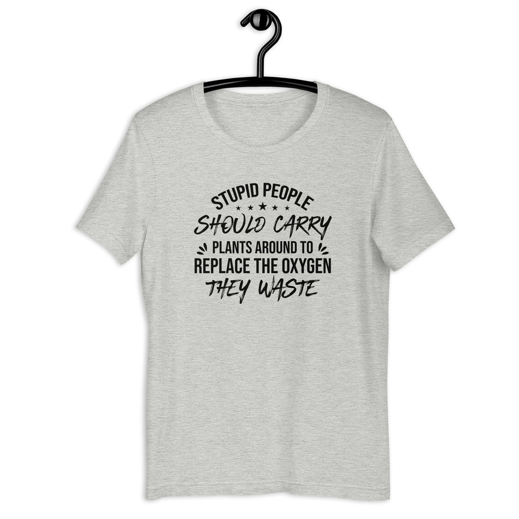 Serve up some savage humor with the “Stupid People Should Carry Plants Around to Replace the Oxygen They Waste” t-shirt. Perfect for those who appreciate sarcasm with a sharp edge, this tee makes a bold statement that’s guaranteed to get laughs (and maybe a few glares).
