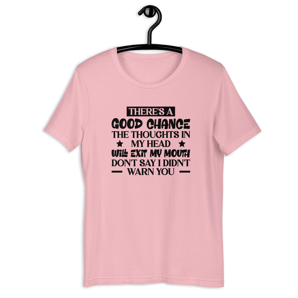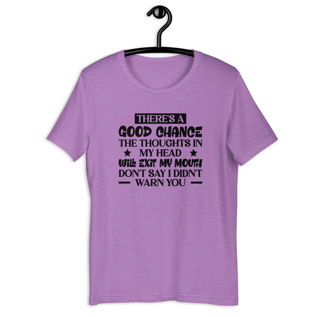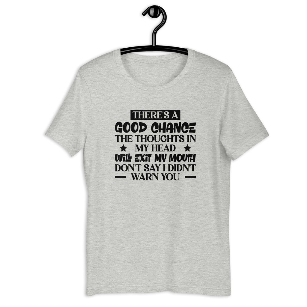 Give everyone a fair warning with the “There’s a Good Chance the Thoughts in My Head Will Exit My Mouth — Don’t Say I Didn’t Warn You” T-shirt — the perfect tee for people who think fast, speak faster, and have absolutely no filter installed. This shirt captures that hilarious truth of being the type who means well… but whose mouth sometimes gets a head start.