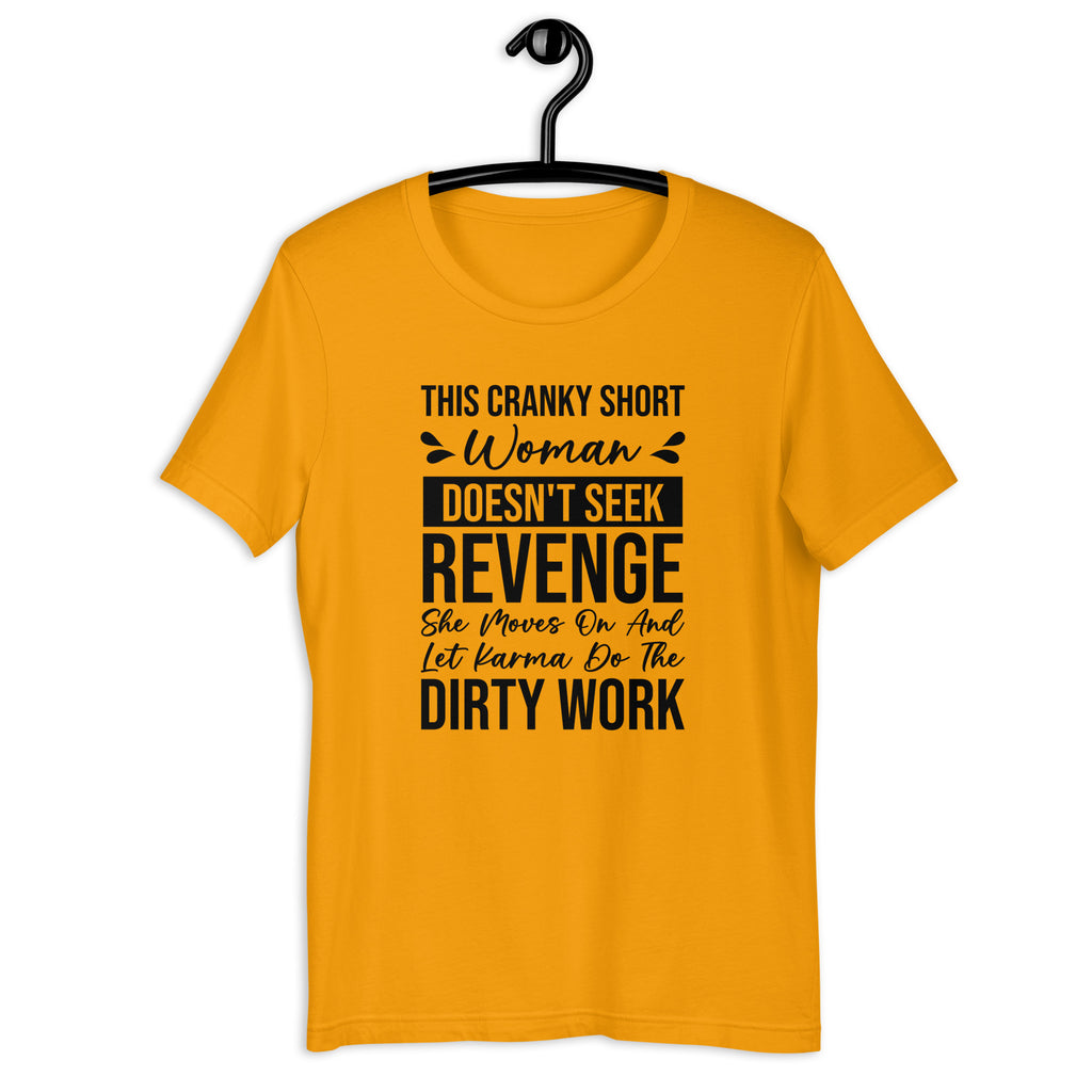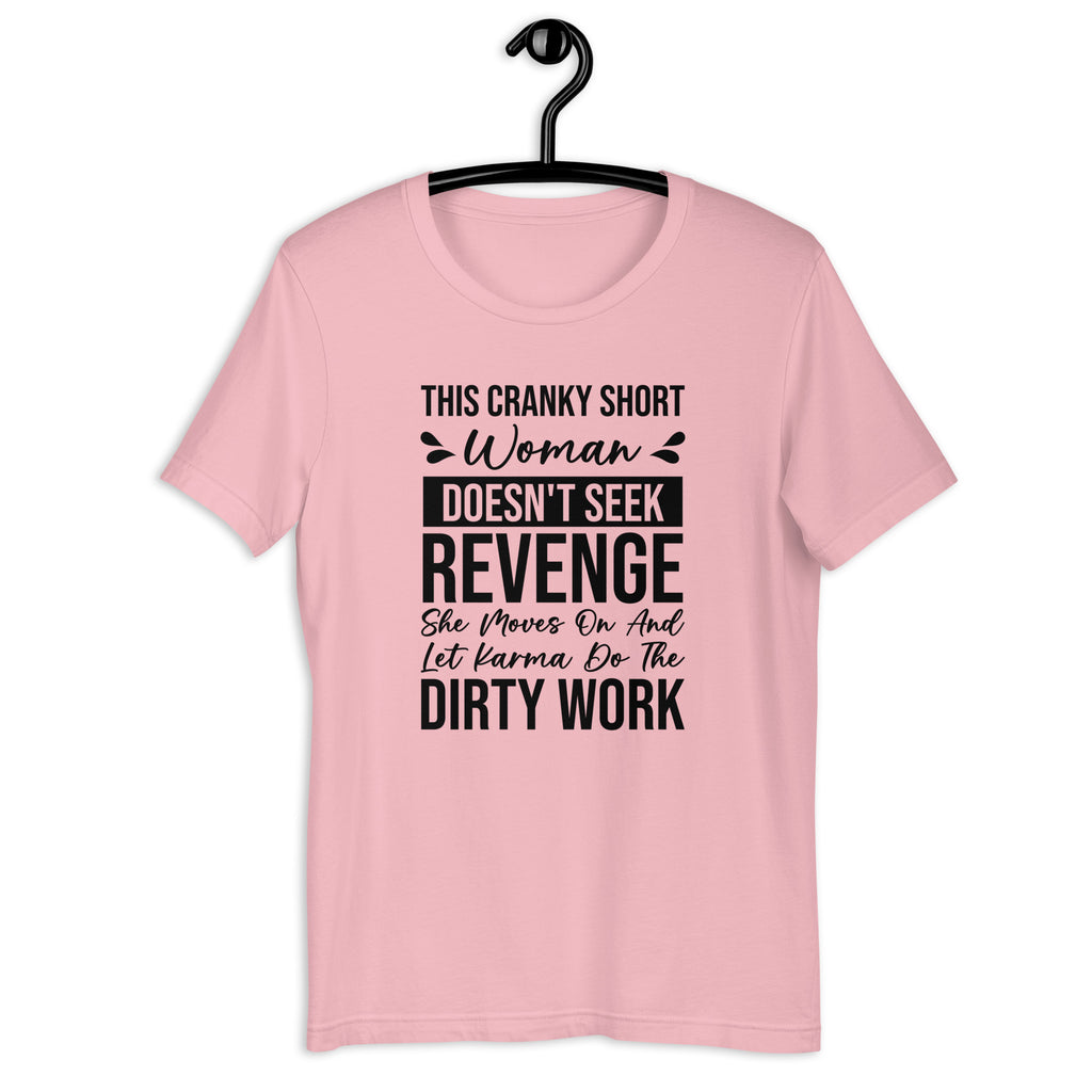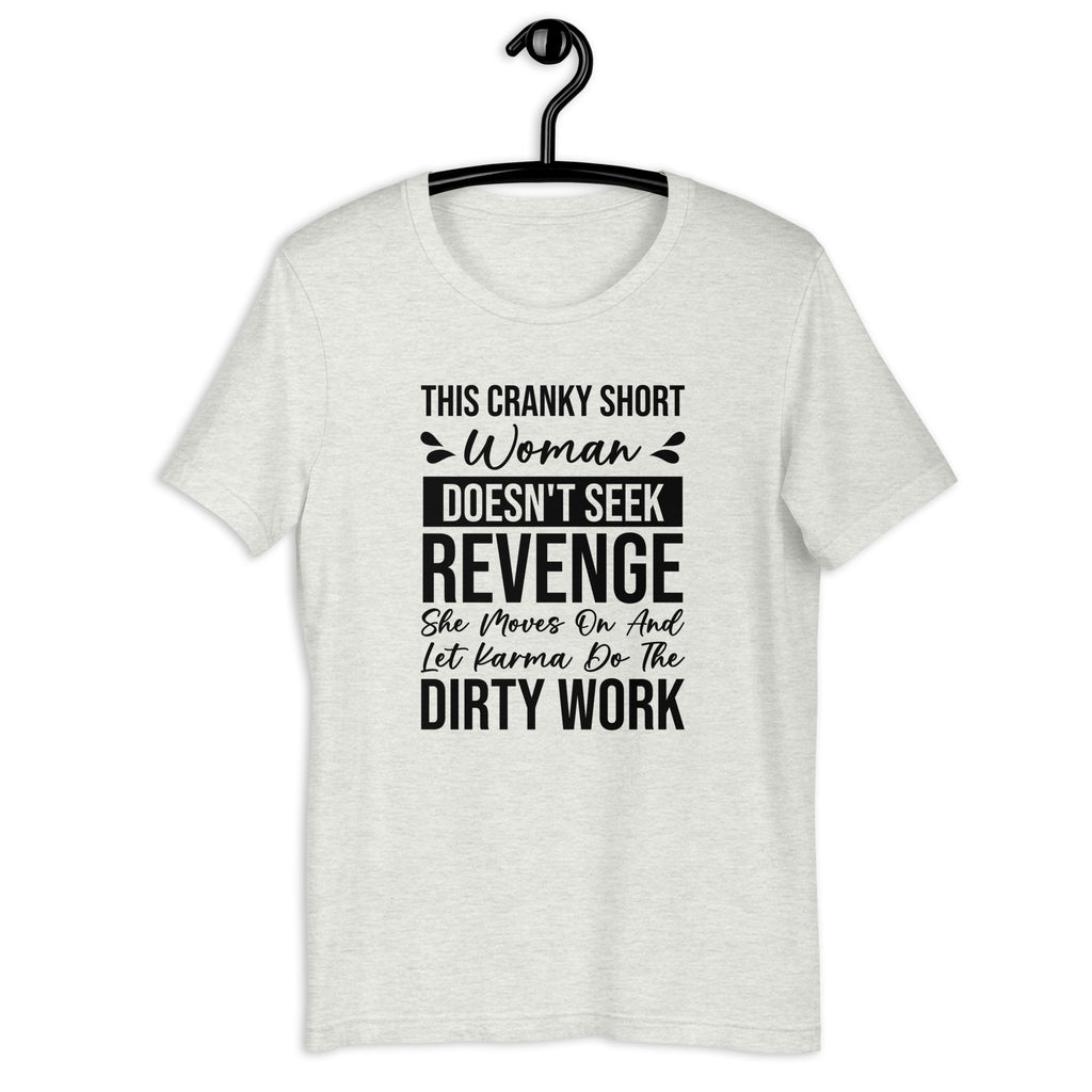 Own your attitude with this “This Cranky Short Woman Doesn’t Seek Revenge, She Moves On and Lets Karma Do the Dirty Work” t-shirt. Equal parts feisty and empowering, this tee is perfect for strong women who know their worth and let karma handle the rest.