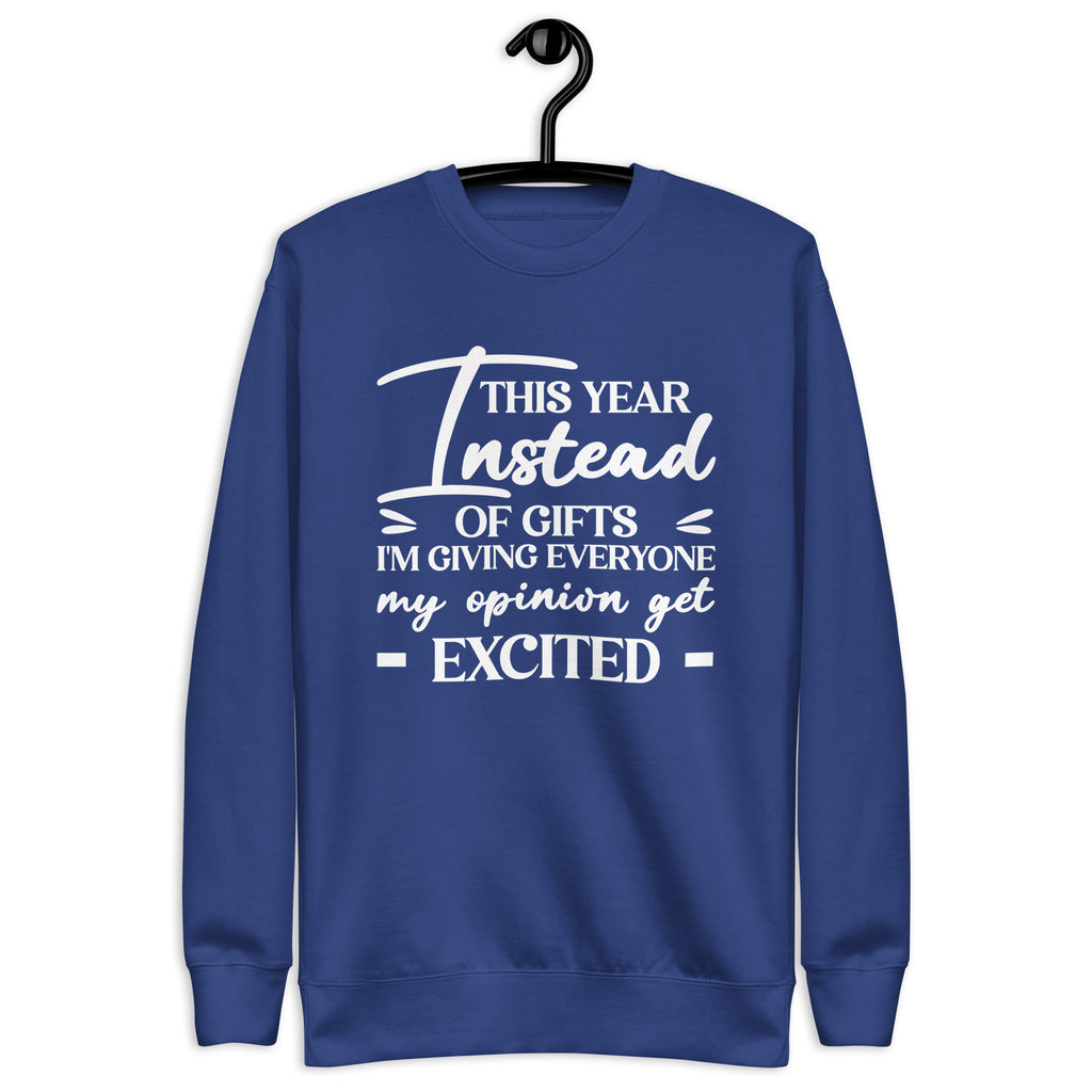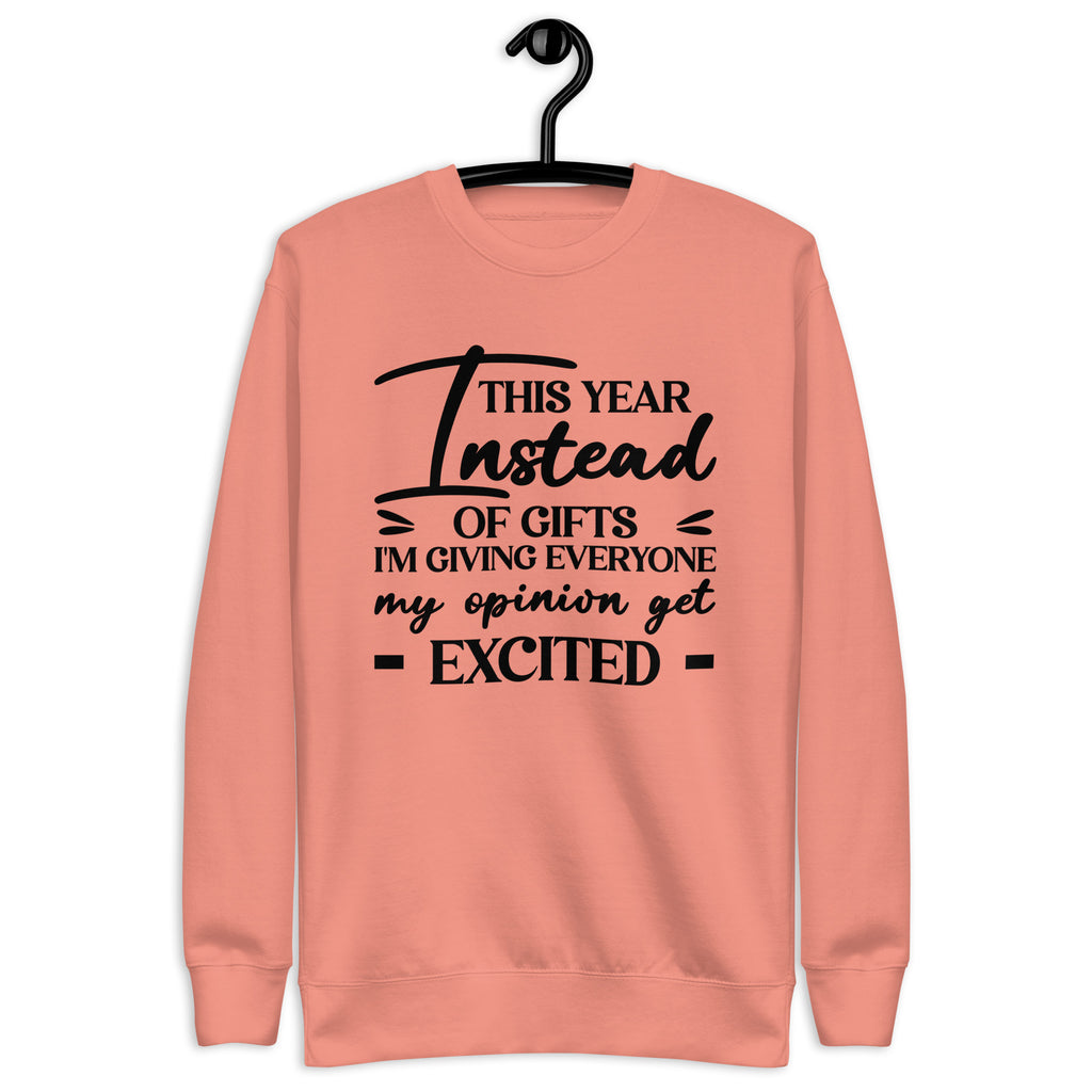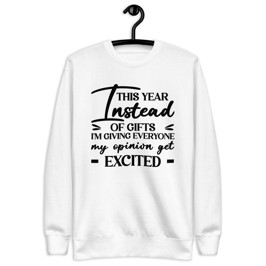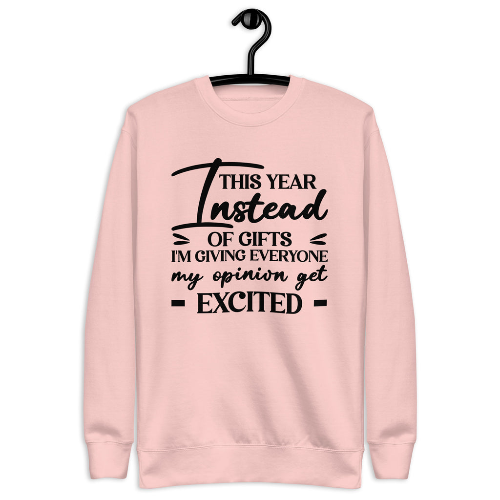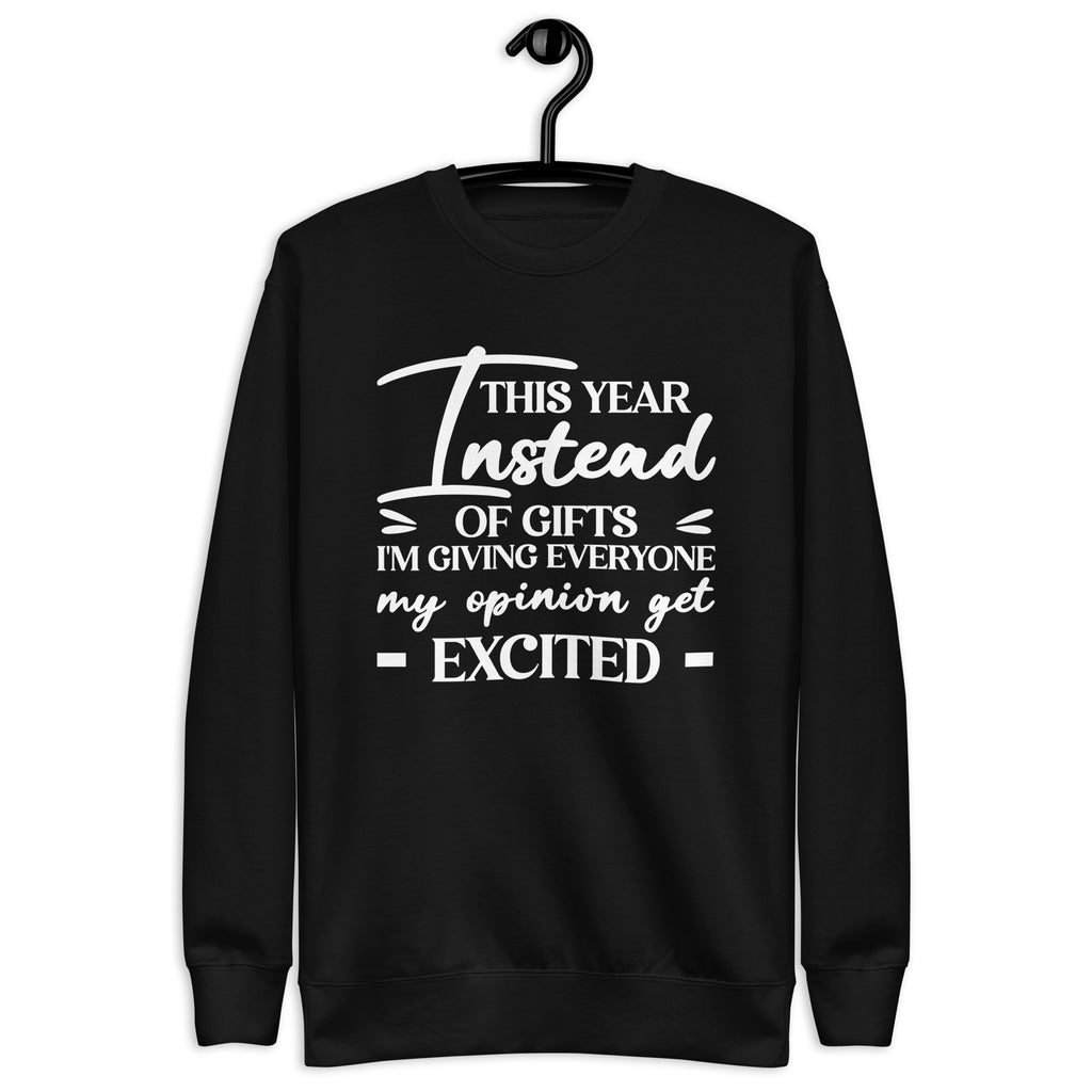 Funny, bold, and delightfully honest. The “This Year, Instead of Gifts, I’m Giving Everyone My Opinion—Get Excited” sweatshirt is perfect for those who love sarcasm, speaking their mind, and gifting a little sass instead of stuff. It’s a playful twist on holiday cheer that’s guaranteed to get laughs.