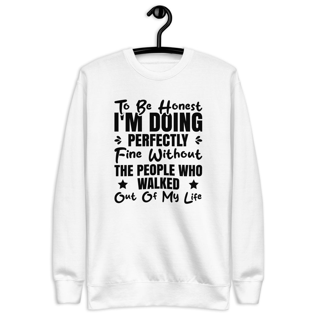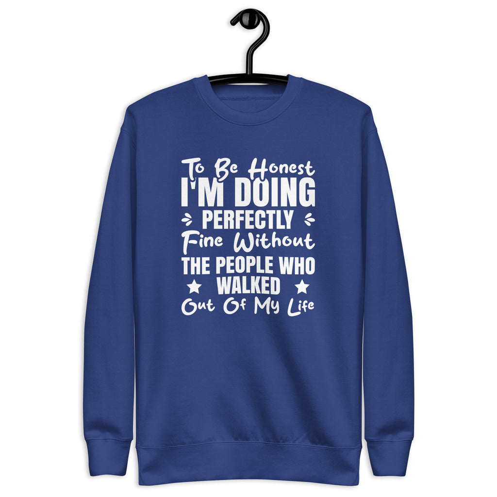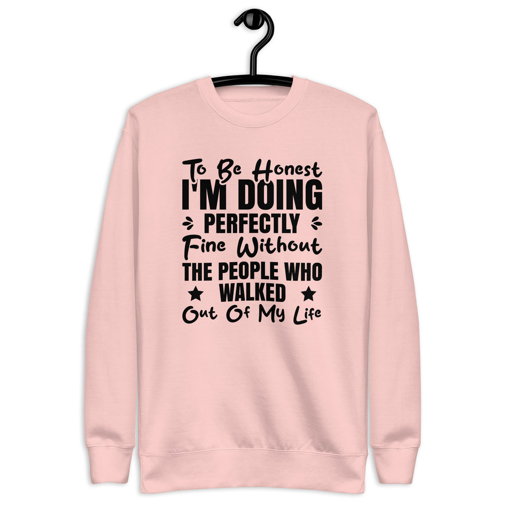 Empowering, honest, and unapologetically strong. The “To Be Honest, I’m Doing Perfectly Fine Without the People Who Walked Out of My Life” sweatshirt is perfect for anyone who has learned to thrive on their own terms. It’s a bold statement of resilience, self-worth, and moving forward with confidence.