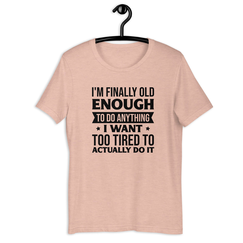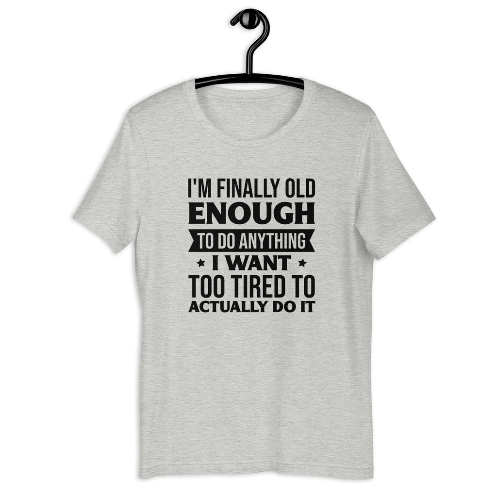 Getting older comes with perks—like being old enough to do whatever you want. The catch? You’re usually too tired to actually do it! This hilarious tee captures that perfect mix of freedom and exhaustion with the phrase “I’m Finally Old Enough To Do Anything… Too Tired To Actually Do It.”