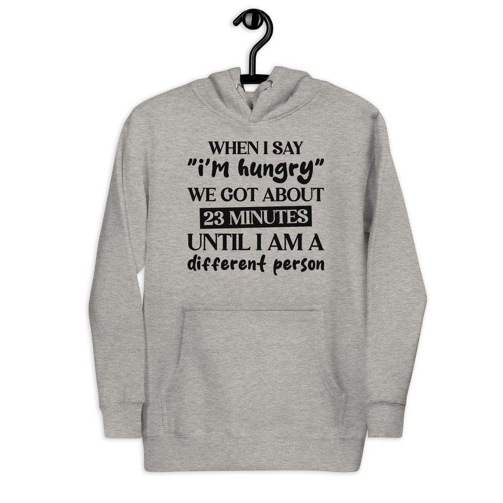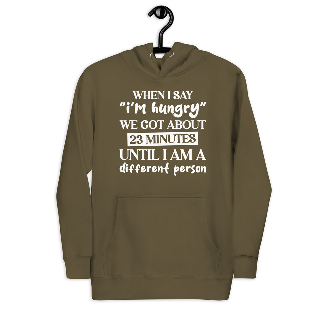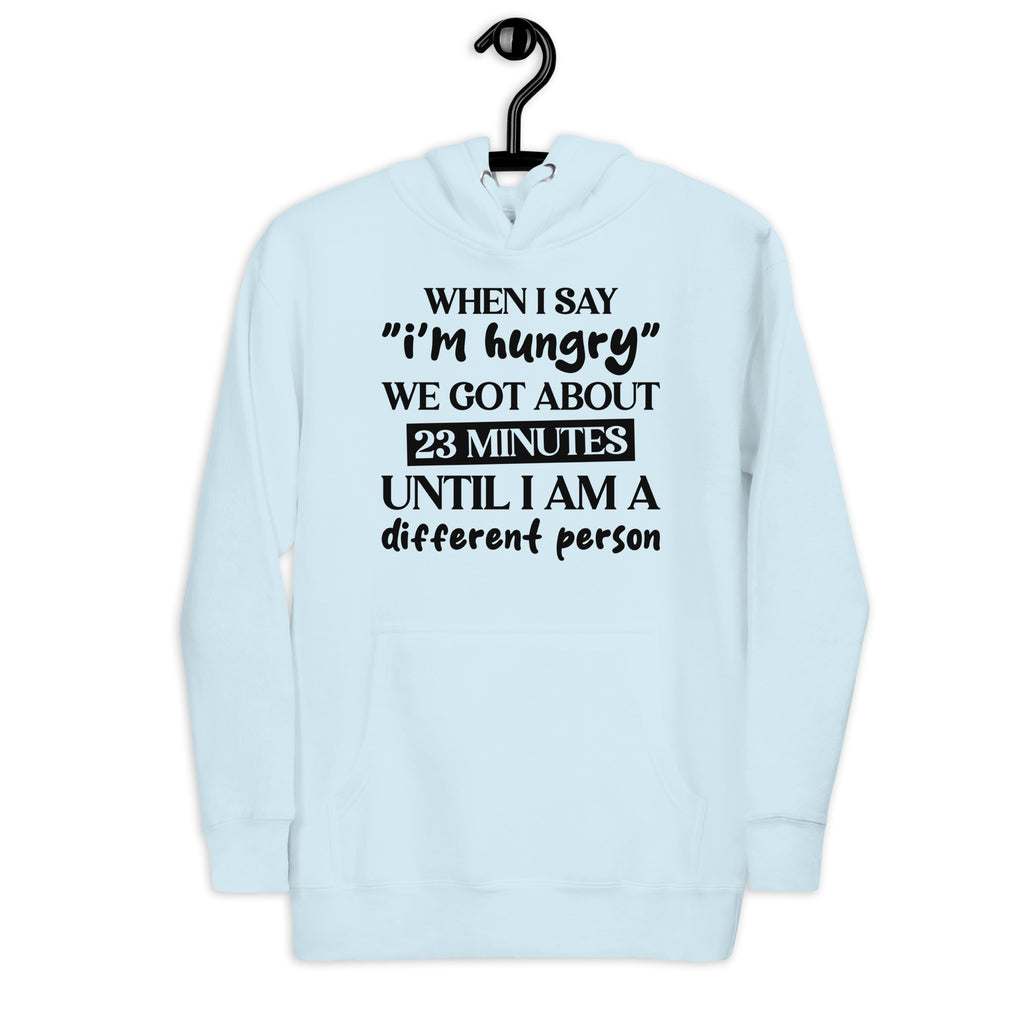Keep it real (and well-fed) with the “When I Say I’m Hungry, We’ve Got About 23 Minutes Until I’m a Different Person” hoodie. Perfect for anyone who gets a little hangry, this funny and relatable hoodie is a gentle warning to those around you — feed me, or deal with the consequences.