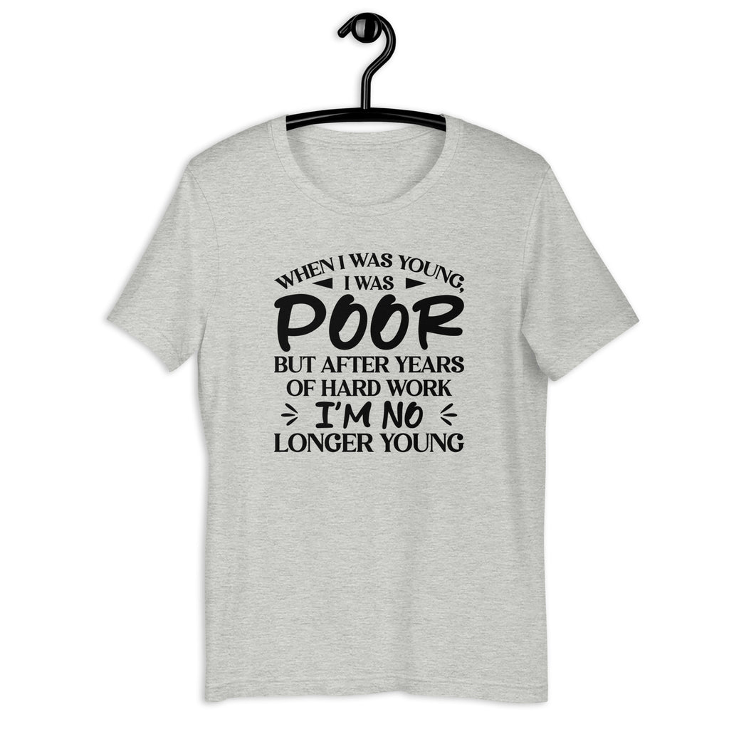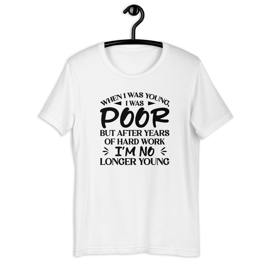 Bring a dose of grown-up humor to your wardrobe with this “When I Was Young I Was Poor, But After Years of Hard Work I Am No Longer Young” t-shirt! Perfect for anyone who’s worked hard, survived adulthood, and earned every laugh line along the way, this tee delivers wit, irony, and a touch of midlife truth.