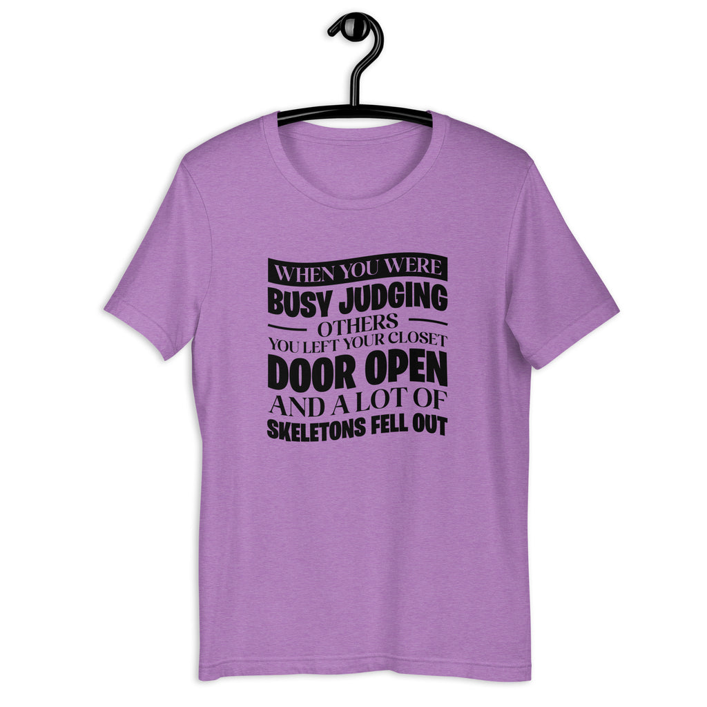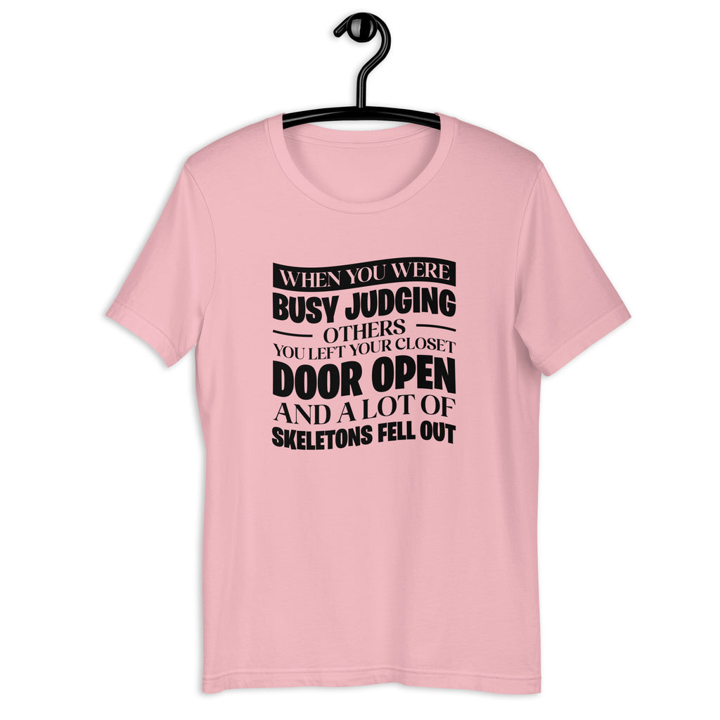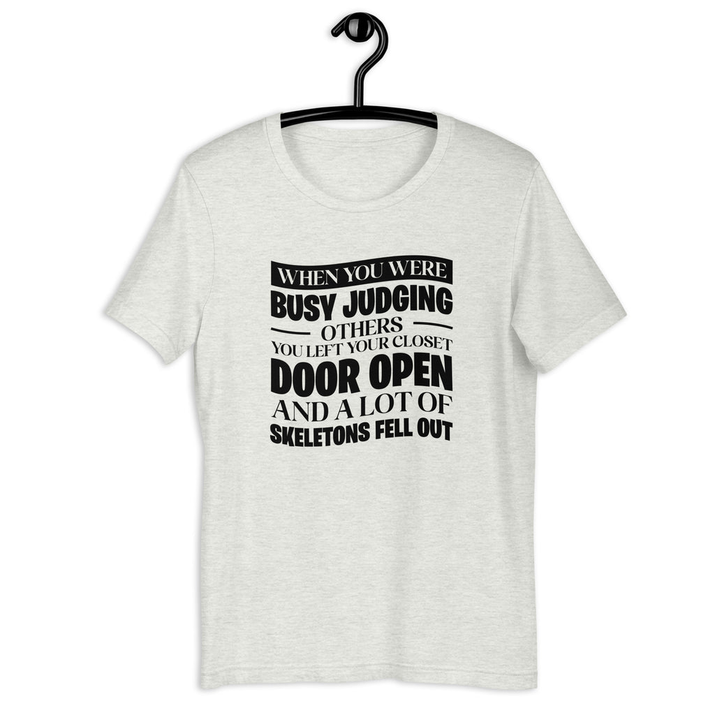 Serve up truth with a side of sass in the “When You Were Busy Judging Others, You Left Your Closet Open and a Lot of Skeletons Fell Out” t-shirt. Perfect for anyone who’s tired of hypocrites and loves calling out double standards, this shirt delivers a bold message with humor and bite.