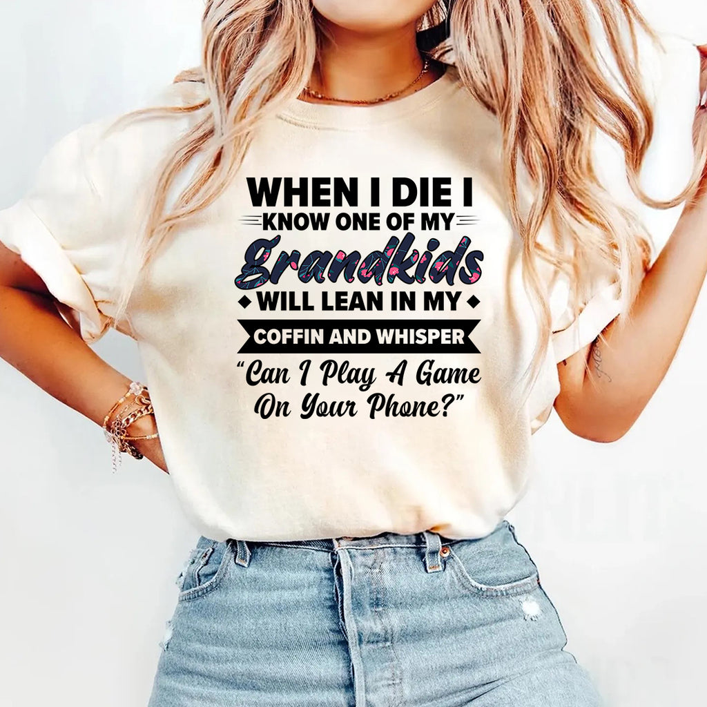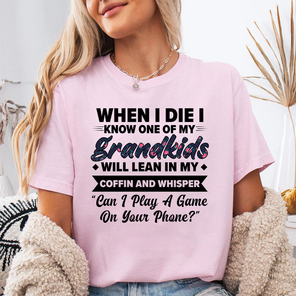 Our When I Die… Can I Play a Game on Your Phone? T-shirt is the perfect mix of dark humor and family truth. With a witty, conversation-starting quote, this tee is ideal for anyone who loves a good laugh — even about life’s inevitable moments. Soft, comfy, and guaranteed to get smiles (and maybe gasps).