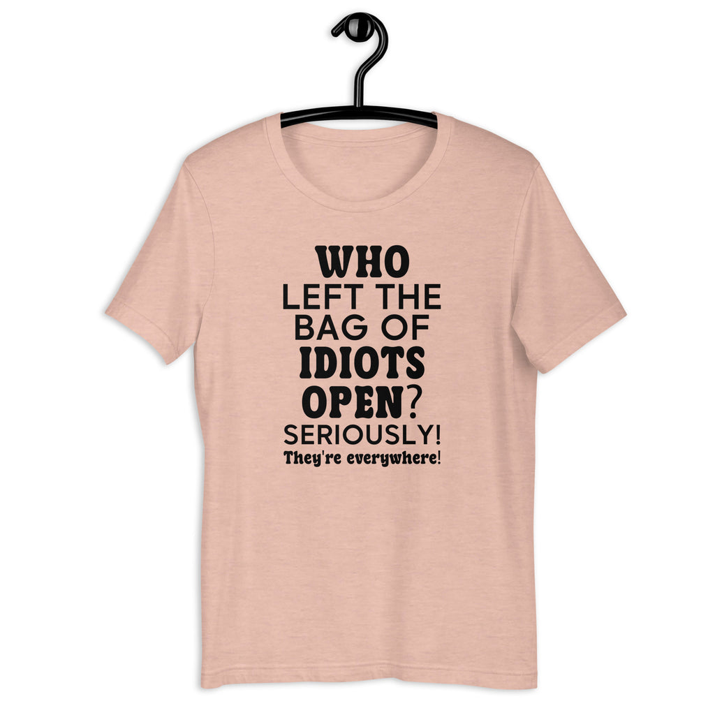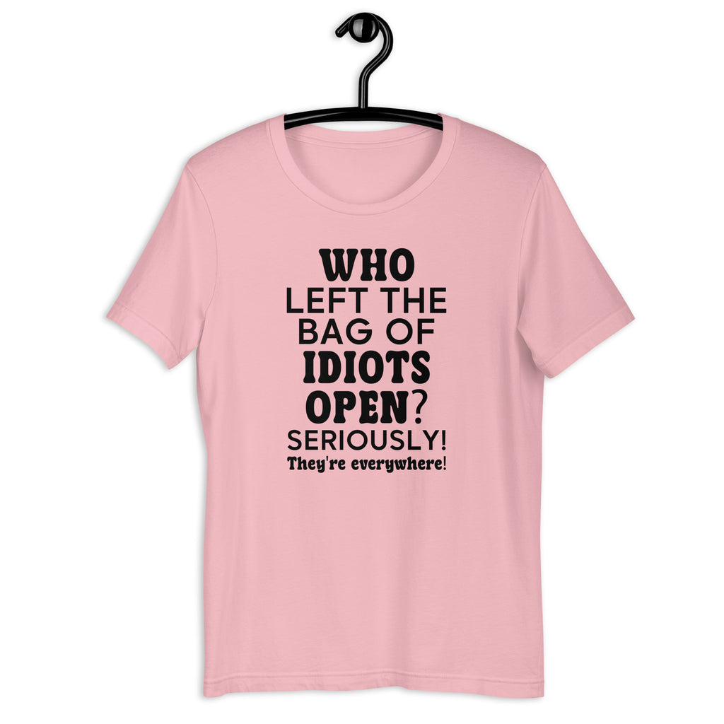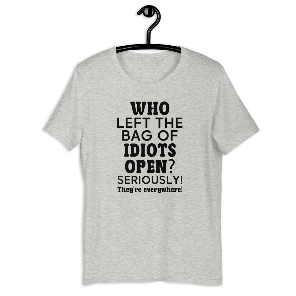 Ever walk into a room and immediately wonder how the bag of idiots got ripped wide open? This hilarious t-shirt sums it up perfectly with the bold phrase: “Who Left The Bag Of Idiots Open? Seriously, They’re Everywhere.” It’s the ultimate tee for anyone who deals with nonsense daily and has the sarcasm to laugh about it.